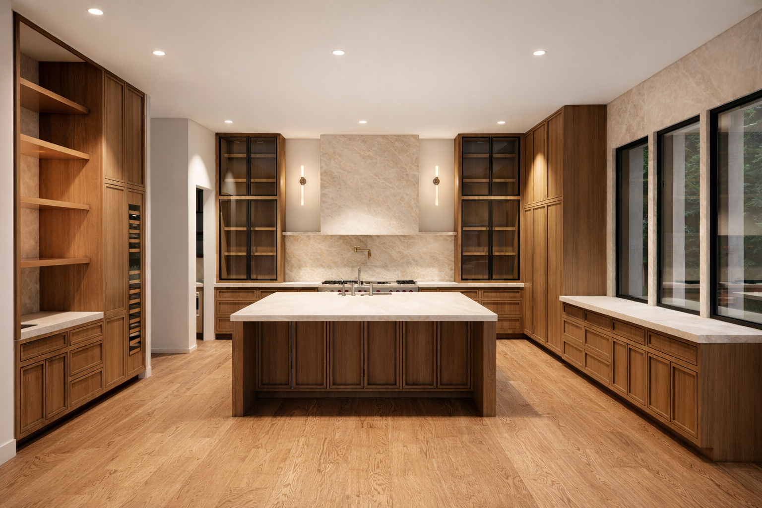 convert this architectural rendering into a highly realistic editorial style luxury real estate photograph suitable for marketing and listing imagery maintain the exact architecture layout geometry cabinetry layout window placement and proportions exactly as modeled do not redesign restyle or modify the architecture or cabinetry do not move or adjust cabinets appliances islands windows or walls enhance realism only through natural lighting accurate material texture subtle reflections and soft shadow depth the image should feel like a professionally photographed architectural digest style interior used for luxury real estate marketing materials in the space include builddirect engineered wide plank flooring in seashore finish walls and ceiling painted origami white by sherwin williams cabinetry featuring a combination of white painted cabinets and natural stained wood cabinets countertops and backsplash in taj mahal quartzite with soft slightly warm tones the wood flooring should show authentic grain correct plank scale subtle tonal variation and a natural matte sheen the natural stained wood cabinetry should show realistic wood grain depth natural variation and refined craftsmanship white cabinetry should appear clean crisp and softly illuminated with natural shadow lines at the doors and panel details the taj mahal quartzite counters and backsplash should appear natural and refined with soft movement and subtle warm tonal variation not overly glossy or artificial natural light should be softly entering through the windows in an editorial architectural photography style creating gentle highlights natural interior bounce light and subtle shadow depth throughout the space the furniture and decor shown in the rendering should be treated as placeholders and replaced with high end restoration hardware and pottery barn style staging elements appropriate for a luxury kitchen inside the glass upper cabinets add very minimal restoration hardware style styling only a few carefully placed objects should be visible such as a small stack of neutral ceramic plates a few simple glassware pieces one refined serving object the glass cabinets should remain mostly open and uncluttered maintaining a clean high end appearance add subtle kitchen staging elements such as a neutral stone or ceramic bowl a refined serving tray or board a small stack of curated cookbooks all staging should remain restrained and minimal so the architecture and cabinetry remain the focus the final image should appear highly realistic refined and editorial similar to a luxury architectural digest feature or professionally photographed high end listing do not alter architecture cabinetry layout appliances materials geometry or design only enhance realism and staging
