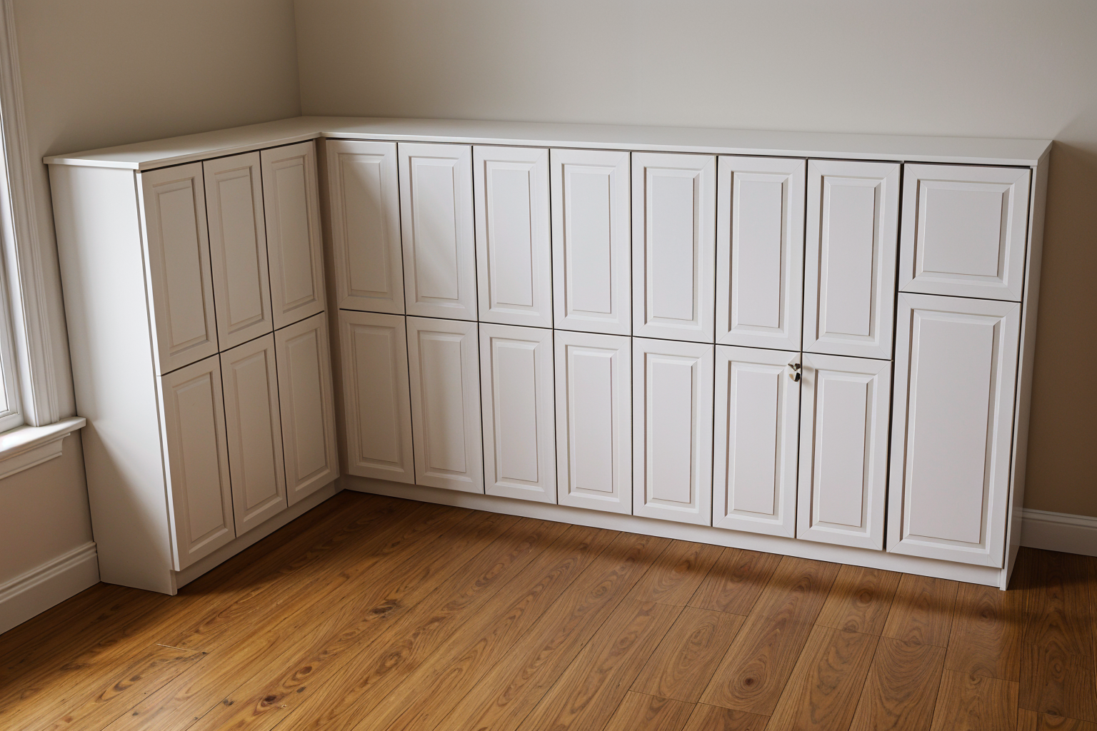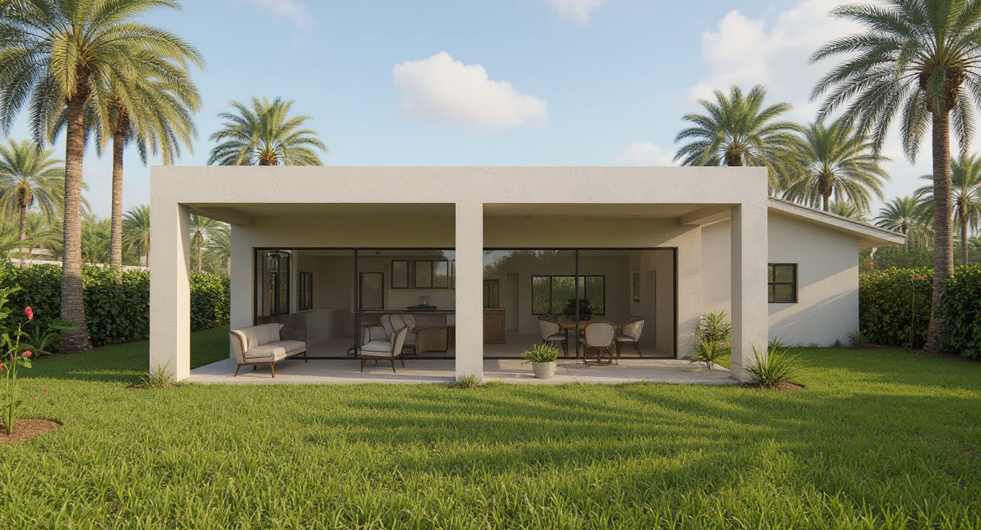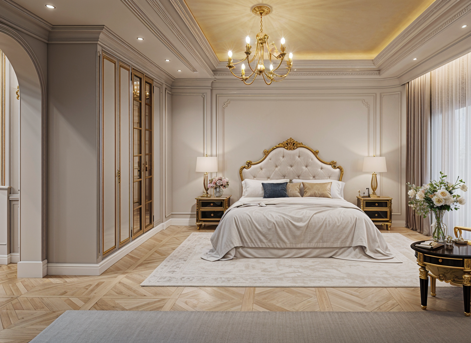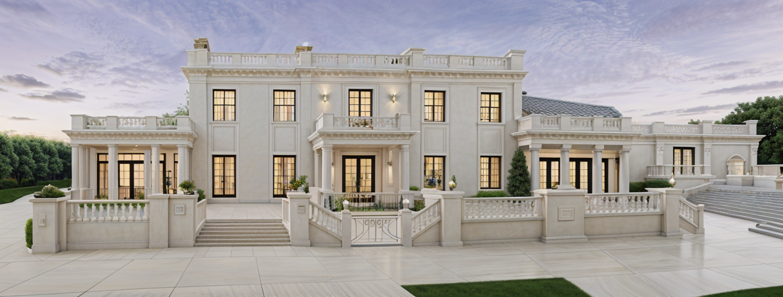 render a luxurious neoclassical mansion with a grand facade the building features large windows and elegant columns use a soft cream color for the walls complemented by light gray accents on the architectural details the windows and railing should have a rich dark wood finish create a serene and sophisticated atmosphere with warm golden lighting to highlight the intricate details surround the mansion with lush green plants and a clear blue sky to enhance the tranquil ambiance architecture