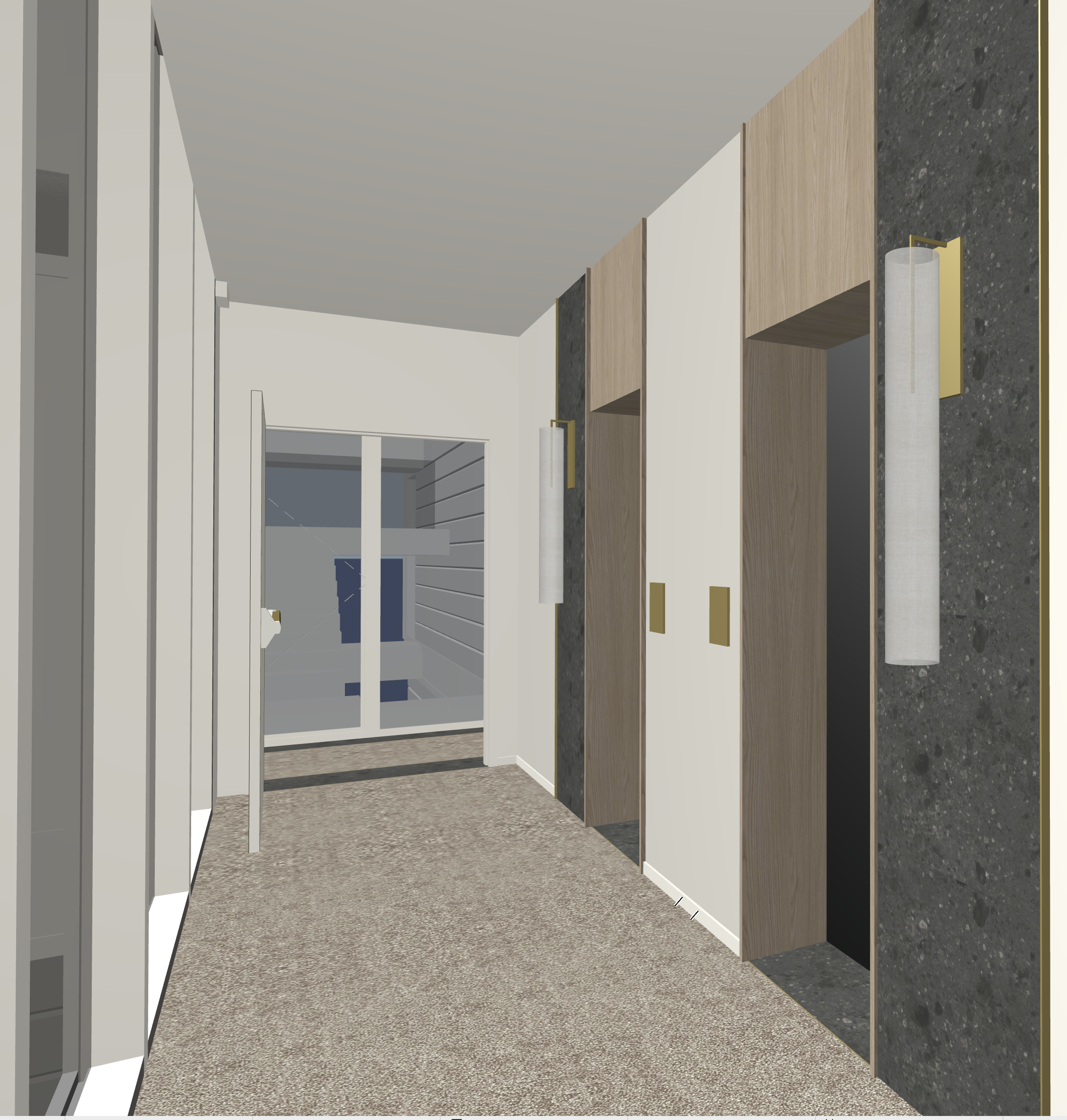 metti una tenda a calata sulla finestra di fondo legno in rovere leggermente sbiancato ottone satinato