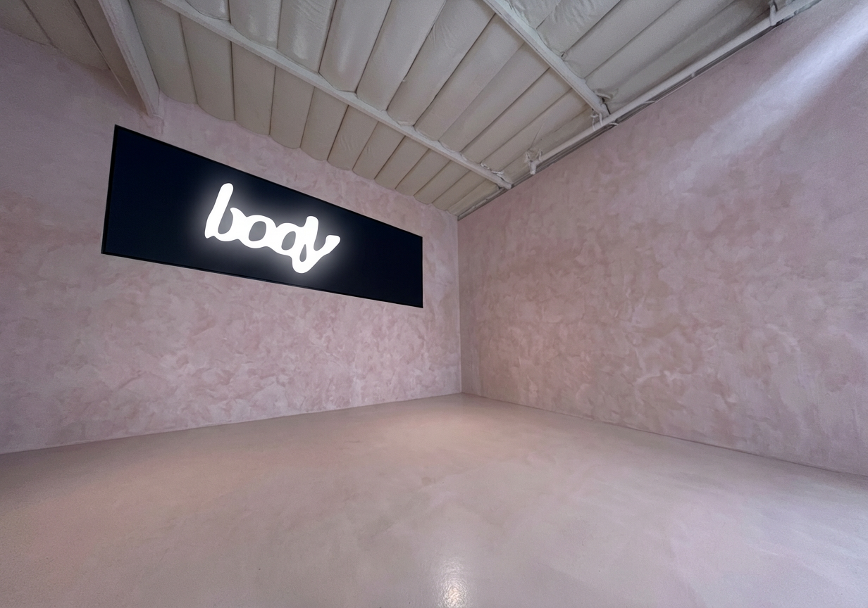 photorealistic architectural interior minimal gallery space with blush pink venetian plaster walls and seamless polished concrete floor integrate a large scale horizontal led screen into the main wall construct a subtle support wall projection extending 6 inches 150mm from the existing wall only behind the screen the projection must be fully blended into the surrounding wall using continuous venetian plaster finish with soft feathered transitions and no visible seams edges or joints the result should read as a monolithic wall surface with a barely perceptible depth change the led screen is flush mounted within this projected plane perfectly aligned and centered maintain clean geometry precise edges at the screen opening only and soft transitions elsewhere lighting soft diffused natural light with gentle shadow gradients to reveal the depth subtly ceiling with exposed white beams high end architectural visualization ultra real materials quiet luxury aesthetic neutral tonal palette monolithic wall integration seamless plaster continuity flush mount detail subtle depth articulation high end interior visualization
