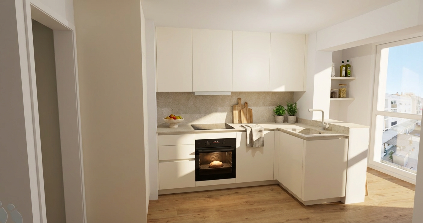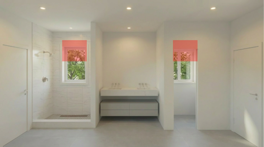 keep everything exactly the same in the rendering do not change the layout walls doors vanity fixtures shower tile or materials only modify the two windows window changes resize both windows to match the size of the red highlighted boxes raise the windows so the new window height and position match the red highlighted areas the windows should become shorter in height and move higher on the wall keep the window style trim and color the same do not change anything else in the room