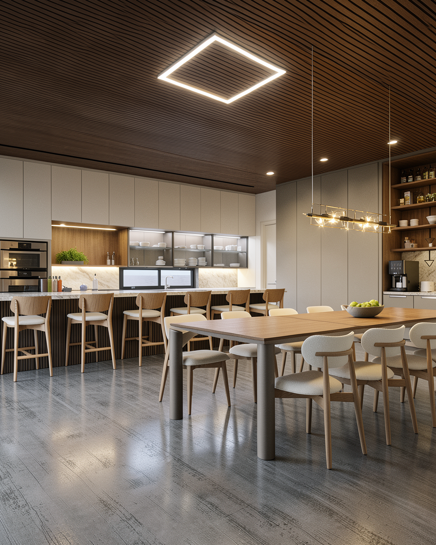 convert this architectural rendering into a highly realistic editorial style luxury outdoor photograph suitable for marketing and listing imagery maintain the exact architecture layout geometry porch structure ceiling design openings and proportions exactly as modeled do not redesign restyle or modify the architecture in any way do not move walls columns windows doors or built in elements enhance realism only through natural lighting accurate material texture subtle reflections and soft shadow depth the final result should feel like a professionally photographed architectural digest style exterior used for luxury real estate marketing materials in the space include tilebar 12x24 black slate tile flooring in a herringbone pattern hardie siding painted sherwin williams pure white roof gaf timberline shingles in charcoal color soffits and fascia painted sherwin williams origami white gutters and downspouts in charcoal finish fluted wood ceiling cladding the black slate tile should appear natural matte and slightly textured with subtle tonal variation and realistic grout lines the herringbone pattern should read clearly with correct scale and alignment the hardie siding should appear clean and refined with a smooth painted finish showing subtle shadow lines at joints and realistic exterior depth the roof shingles should appear textured and dimensional with natural variation consistent with charcoal architectural shingles the soffits and fascia in origami white should appear soft and clean with subtle tonal depth the gutters and downspouts should appear matte charcoal with realistic metal finish and clean edges the fluted wood ceiling should show realistic wood grain depth and shadow between flutes with a warm natural tone do not add or modify any furniture if furniture is present keep it minimal and secondary to the architecture without adding new elements the outdoor space should feel elevated calm and refined with a strong connection between the porch and yard lighting should include soft natural daylight with gentle exterior shadows and realistic light falloff the lighting should feel balanced and editorial not harsh or overly dramatic the final image should appear crisp photorealistic and editorial similar to a professionally photographed luxury exterior avoid warped or exaggerated wide angle distortion the perspective should feel natural as if captured by a professional architectural photographer with straight vertical lines and balanced proportions do not alter architecture layout geometry or materials only enhance realism