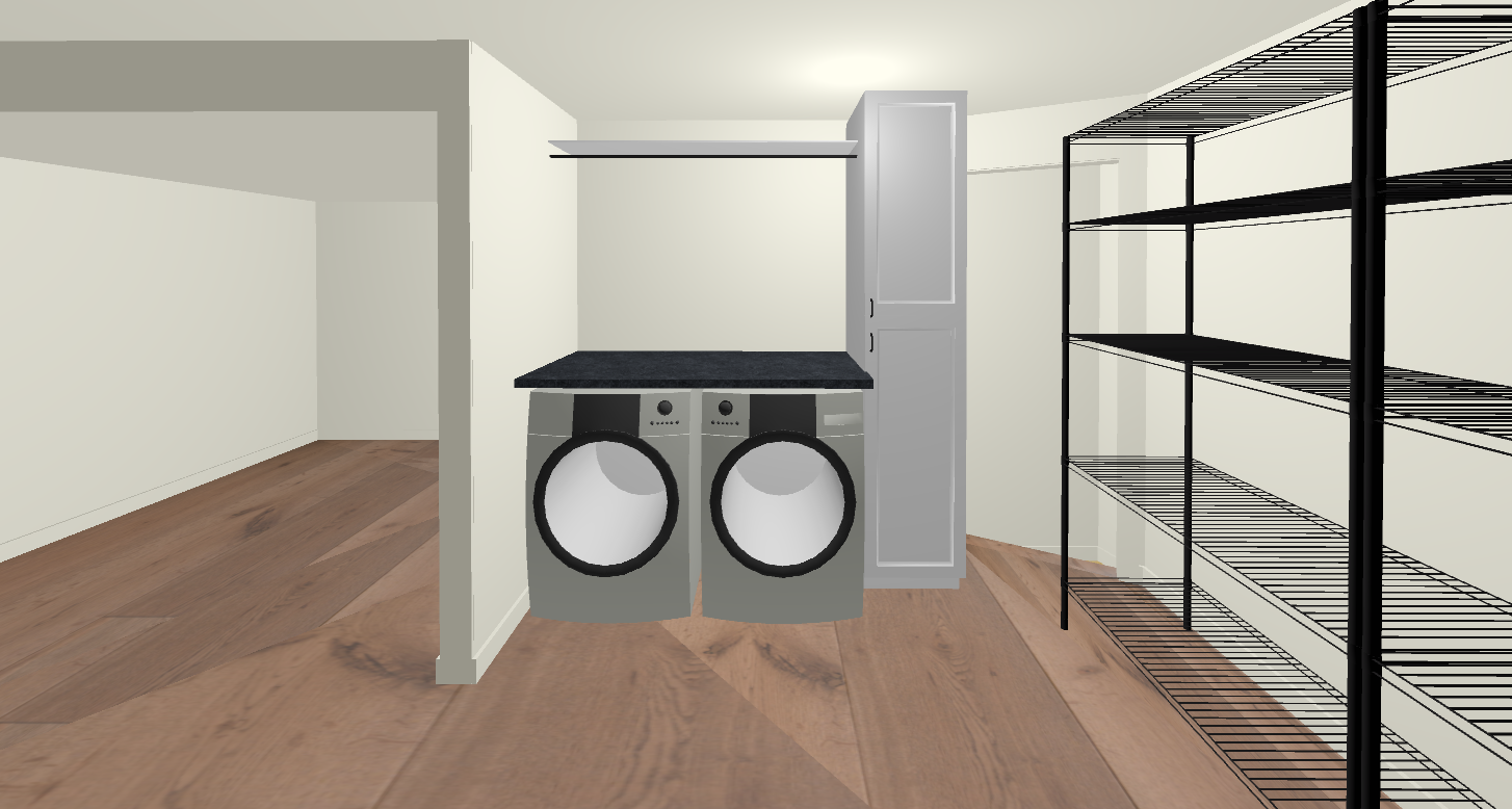 increase thickness of shelf over the rod above the washer and dryer make the washer and dryer red add a large bike hanging vertically seen from the side