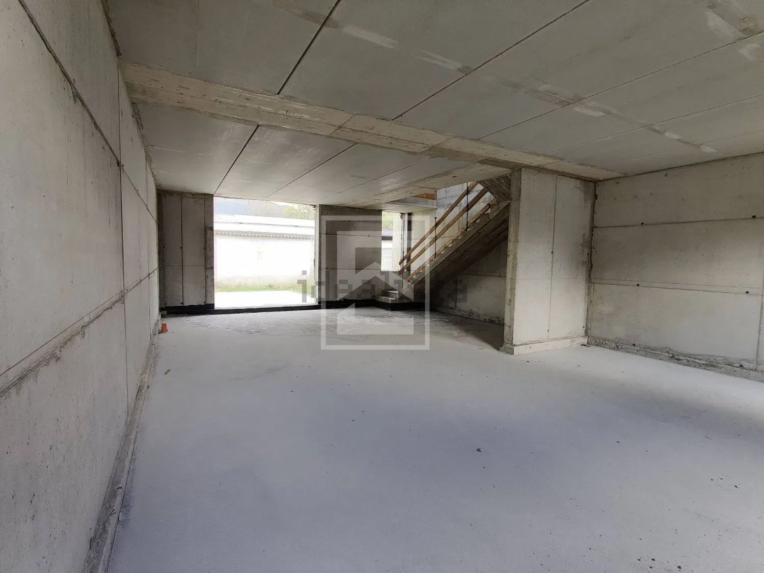 modernist interior shot soggiorno pareti intonacate di bianco pavimento in gres effetto legno infissi bianchi alle finestre scala con ringhiera in acciaio inox tavolo da pranzo con sedie architecture