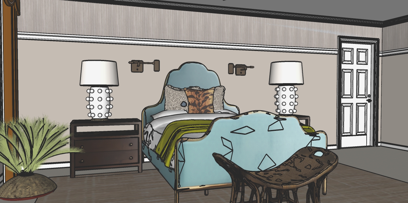 bed has a gold metal frame around the blue fabric the nightstands are a dark brown wood the dresser on the right is black the floor is a off white carpet the lamp shades are pleated add brightness to the ceiling light and the wall sconces the curtains are a cognac color the rug is a very subtle rust orange modern pattern the bench at the end of the bed is bamboo with a woven seat the wall sconces are an antique brass and the crown and trim work is white the top portion of the wall is a neutral grasscloth wallpaper and the bottom part is a paint color that matches the wallpaper the ceiling fan is brass with walnut color wood blades