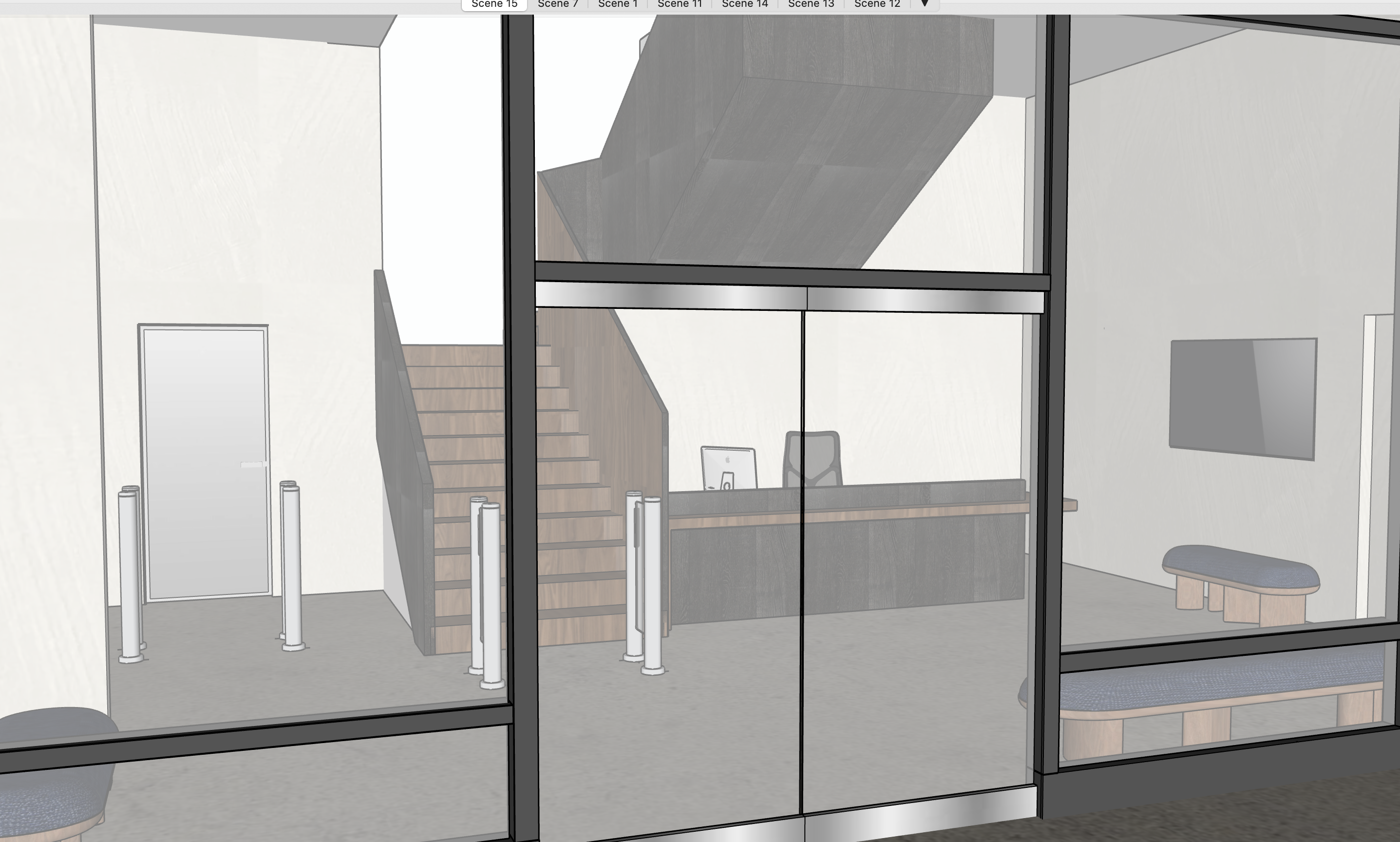 maintain colors and materials in the image make glass frames stainless steel make door in the back opaque glass please make the lighting soft bright even and warm
