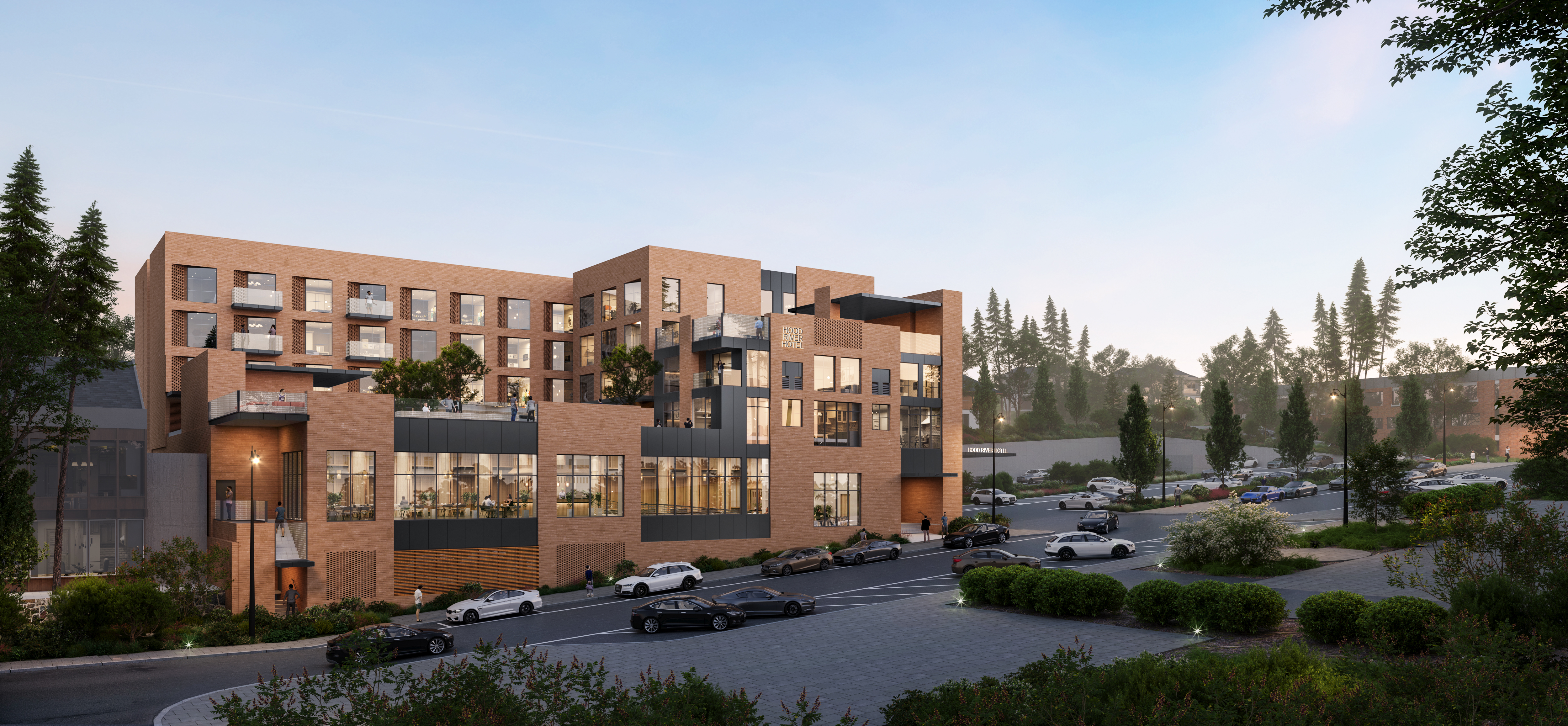 exterior shot the brick is reddish brown add people along the street