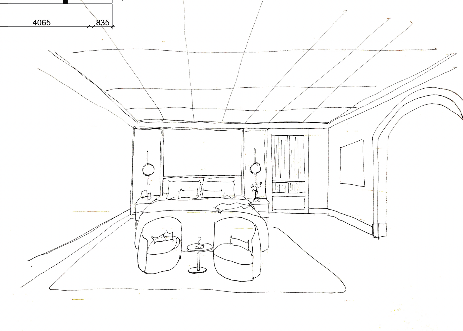 mid modern century bedroom view walnut wood flooring and 200 high wood skirtings with beading edge walls are in a cream textured wallpaper ceiling as a perimeter border to outline the room center of ceiling is in square beveled ceiling detail within each ceiling square is a wallpaper that softens the look feature wall in dark wood and wallpaper behind the bed seating area in front of bed room is warm and cozy but clean and bright at the same time the colors should be calm and reflect modern century look with a curated splash of color rendered in photo realistic view consider layout of room in the floorplan