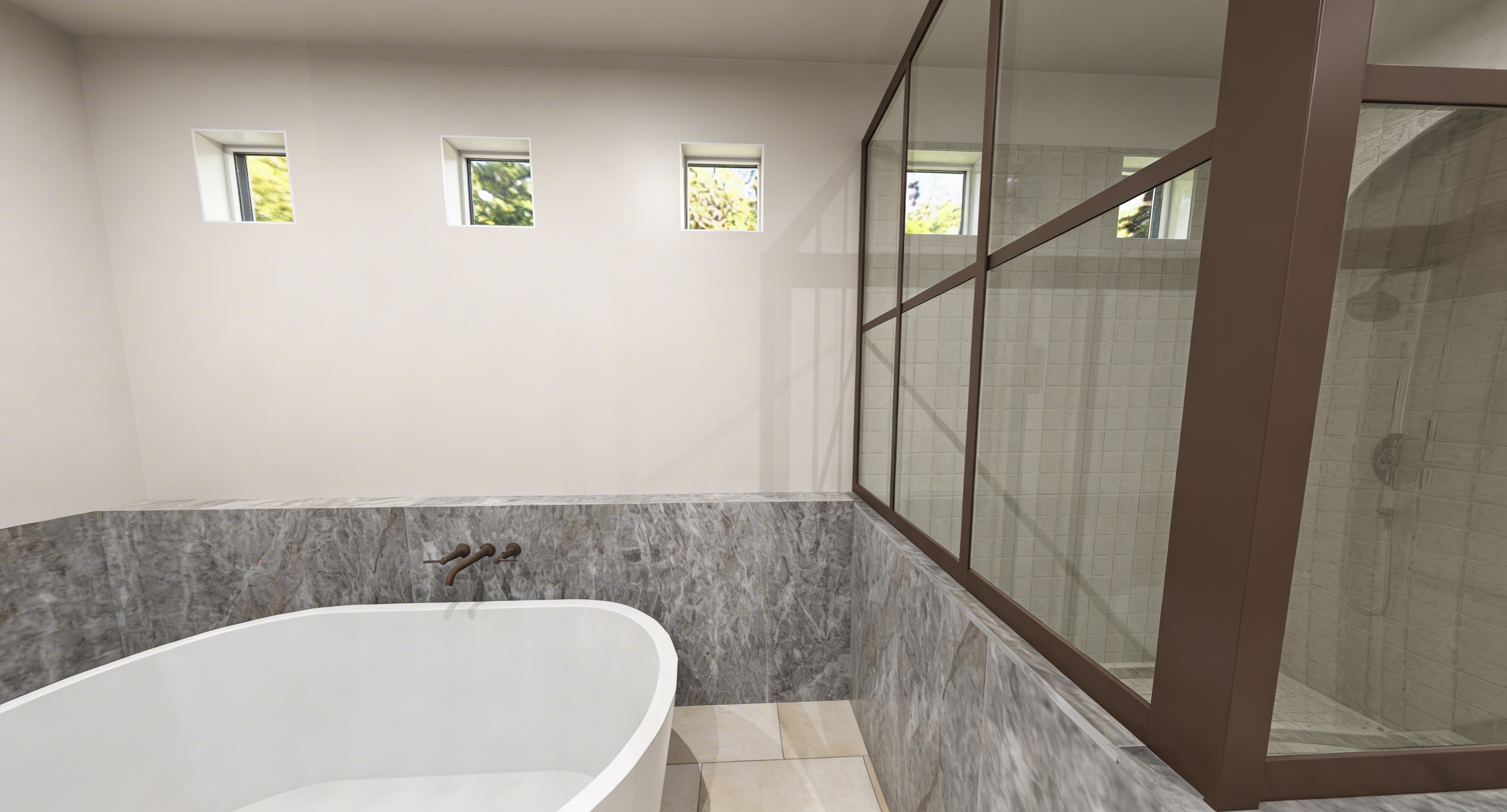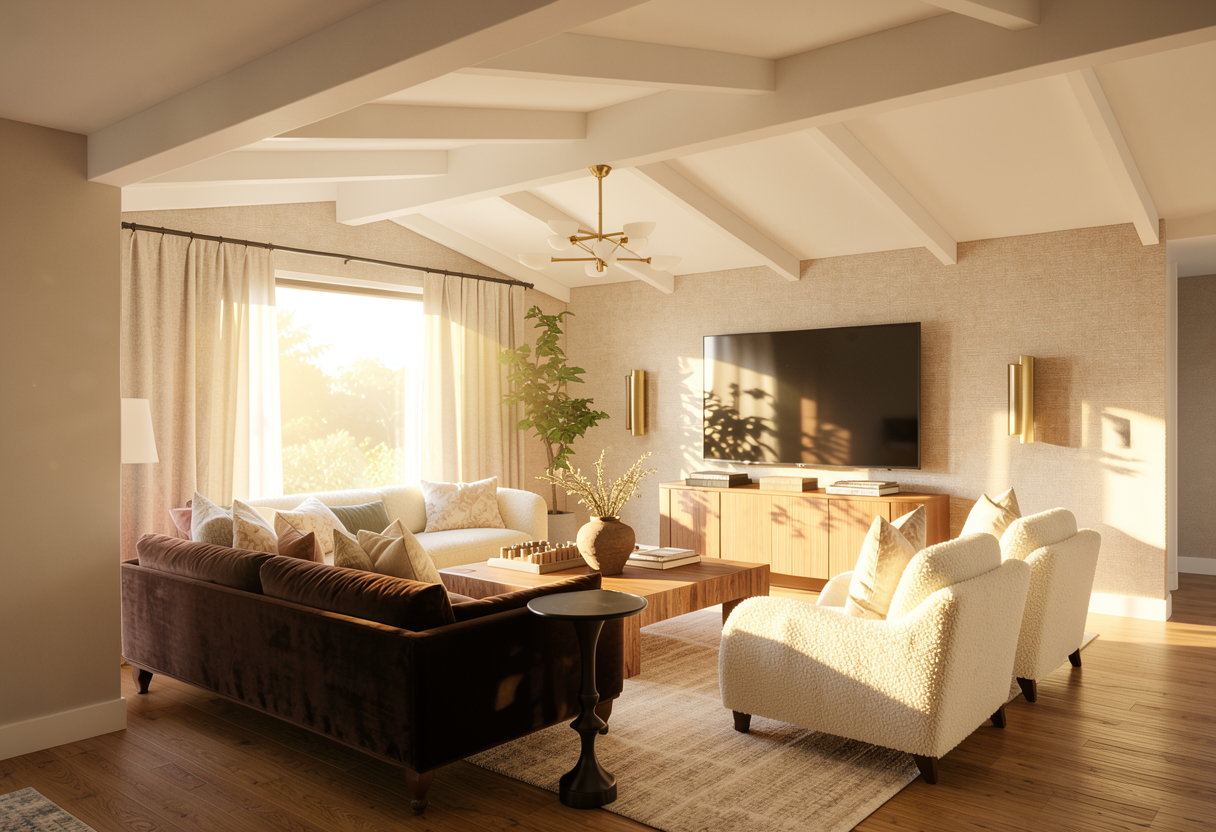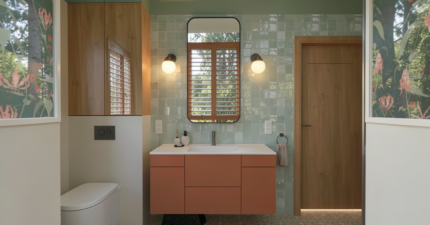 replace the wood wall in the back of this image with a forest scene this forest should should look like a forest from vancouver bc the windows on the right to remain the same add roller shades on the windows which come down 24 from the ceiling delete the existing art on the back wall