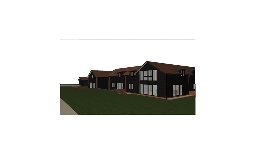create a photorealstic visual of this barn from my archietcts sketch model windows black cladding is vertical black timber at ground floor and horizontal black timber at frost floor and dormers this is a new build