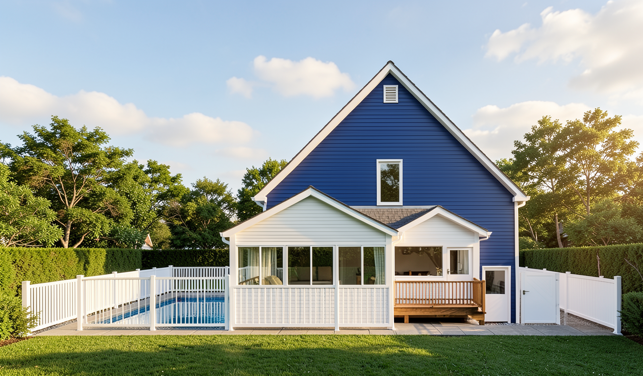 can you make this look more realistic white solid vinyl fence make pool front of room width of room maintain doors and windows deck two tone grey color concrete patio around pool