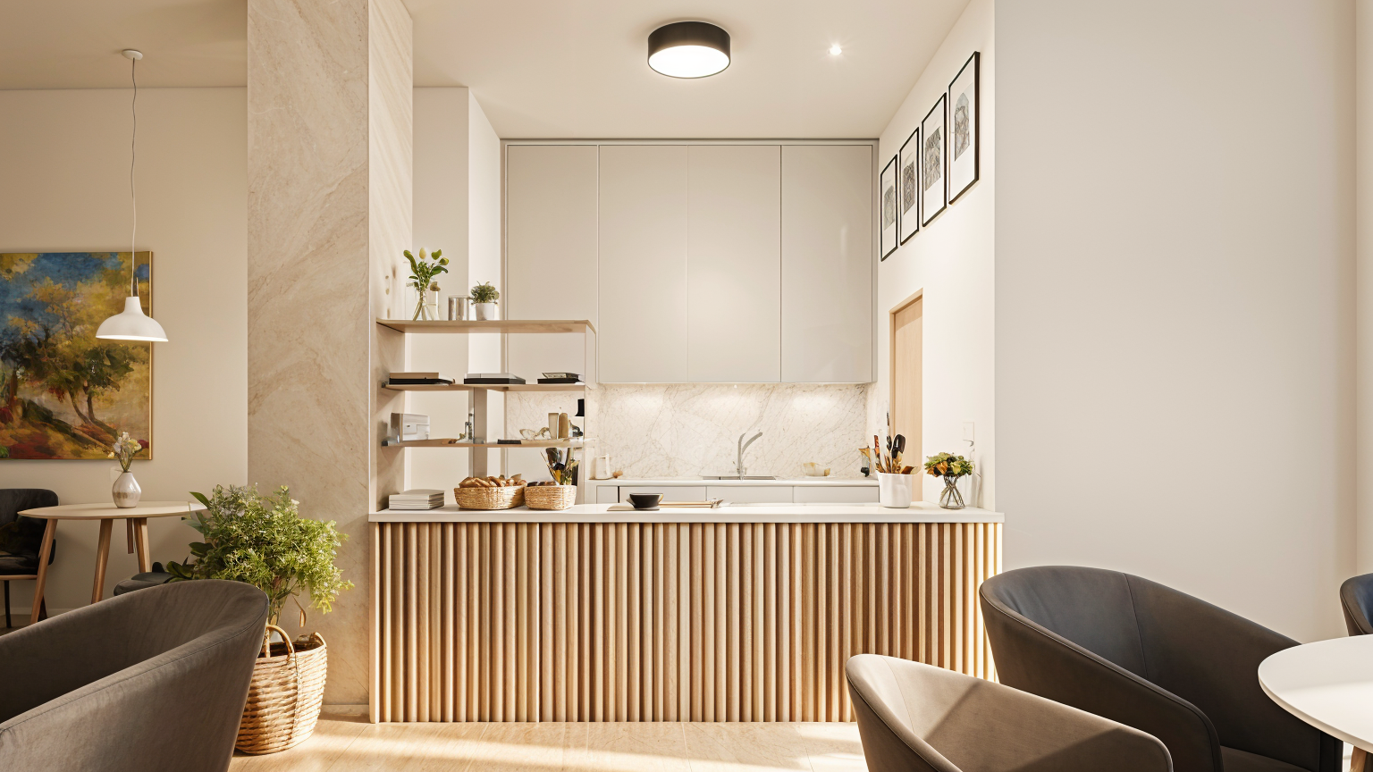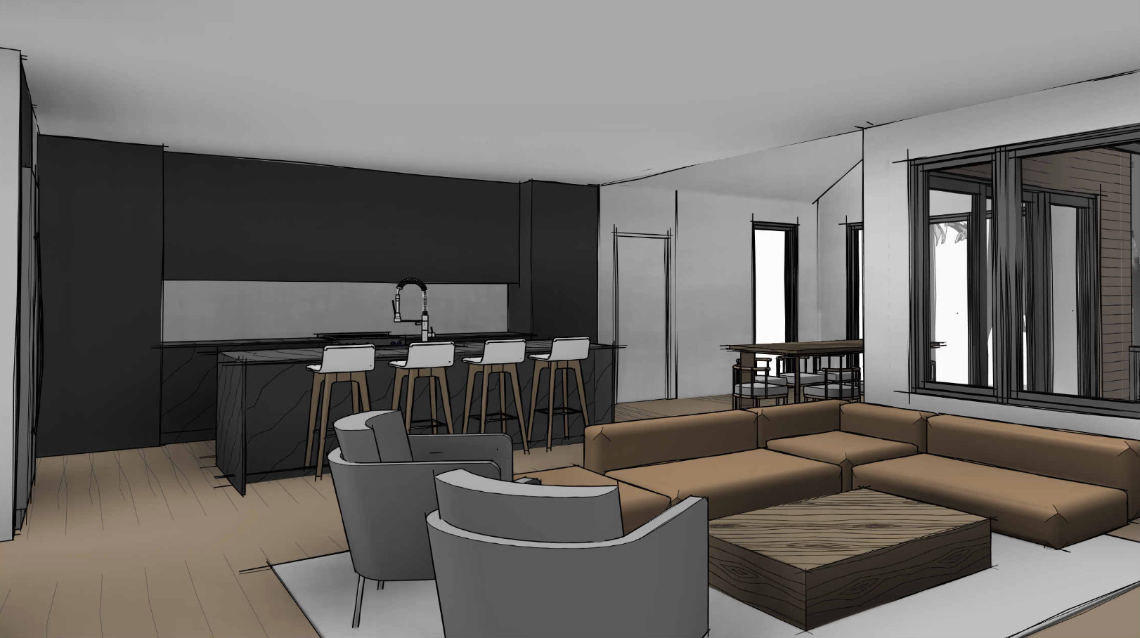 make this look realistic ultra modern with bleached white oak floor all matte back hardware stainless appliances and ultra modern contemporary finishes high end cabinets should be grieve or grey or taupes or white walls should be sherwin williams repose gray and stools dining room fabric should be a deep steel blue or turquoise