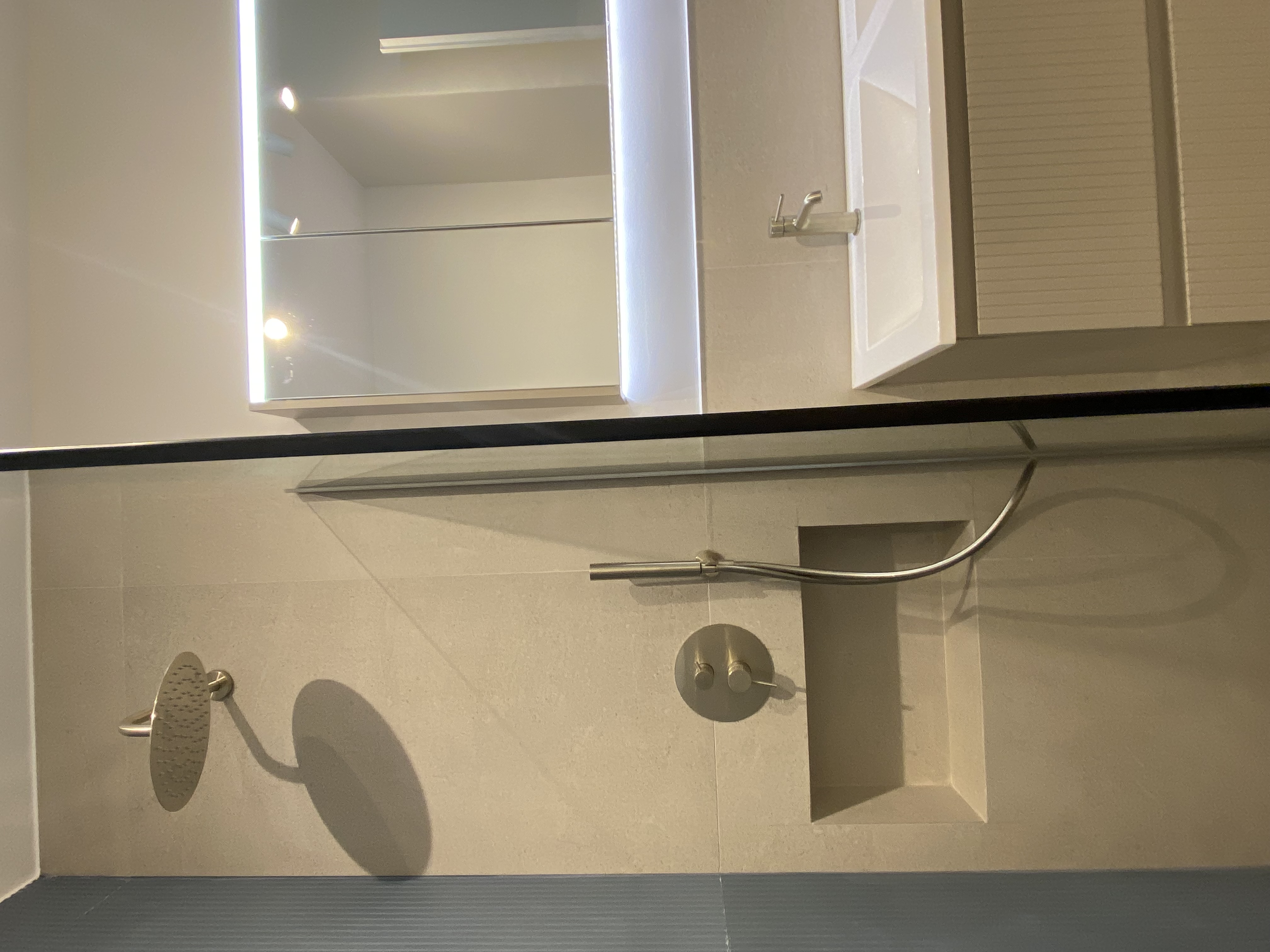 enhance this image in a professional real estate photography style while strictly preserving the original lighting fixtures and scene do not modify or reinterpret any light sources keep the exact lighting direction intensity and color temperature as in the original image improve overall image quality by increasing sharpness clarity and resolution remove pixelation and compression artifacts while maintaining natural textures apply subtle noise reduction and detail enhancement without creating an artificial or overprocessed look correct lens distortion and straighten vertical lines balance exposure gently without flattening contrast keep materials realistic avoid overly smooth or cgi like surfaces reduce or remove unwanted reflections and glare from the shower glass and mirror eliminate distracting reflections such as light hotspots or camera reflections while keeping the glass and mirror surfaces natural clean and realistic do not alter their shape position or surrounding materials do not change colors objects layout or lighting setup in any way only enhance the existing photograph