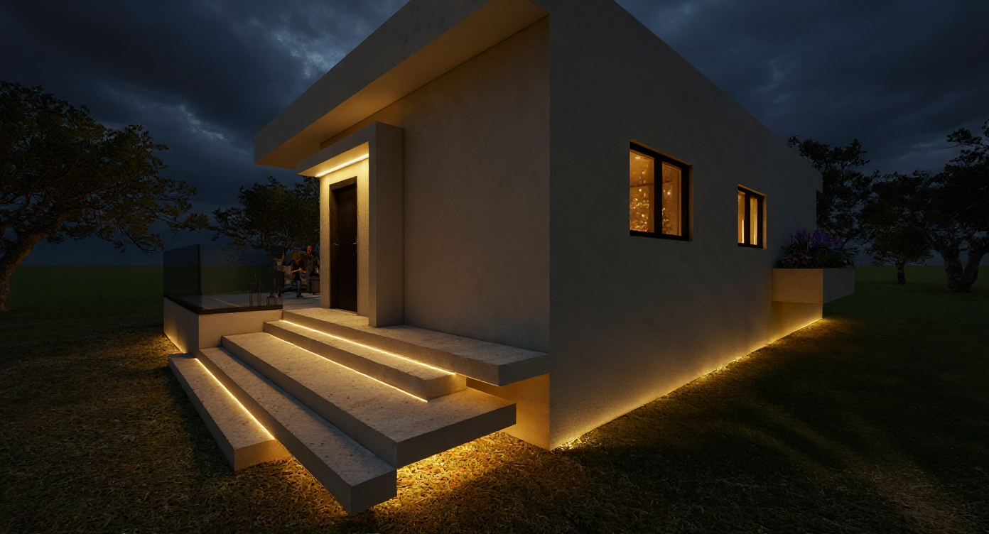 add handles on the exterior doors make the image more cozy add nice details delete the light on the base of the building add it on the trees