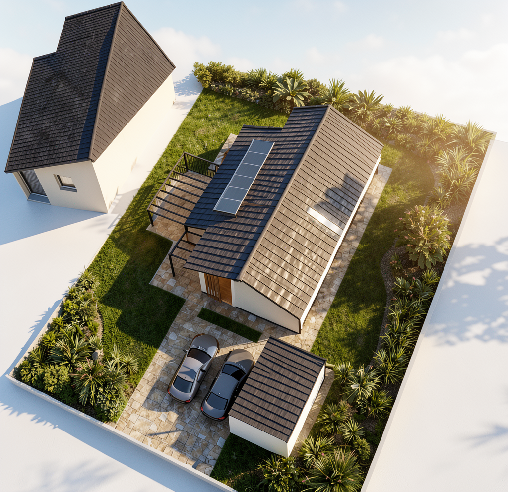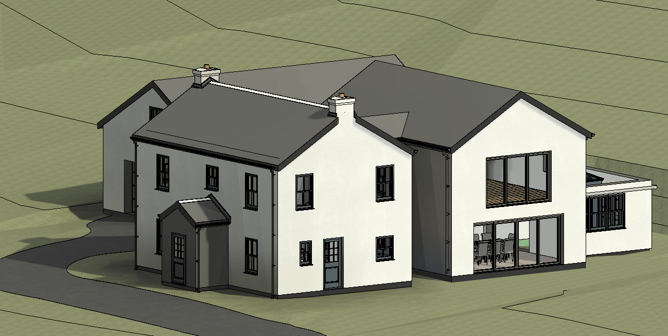 contemporary exterior shot render a beautiful image of a modern farmhouse with crisp white walls and a sleek dark gray roof the windows are framed in elegant black adding contrast and sophistication surround the house with lush green grass and gentle rolling hills under a clear blue sky creating a serene and inviting atmosphere ensure the light captures the texture of the house and landscape offering warmth and clarity to the scene architecture
