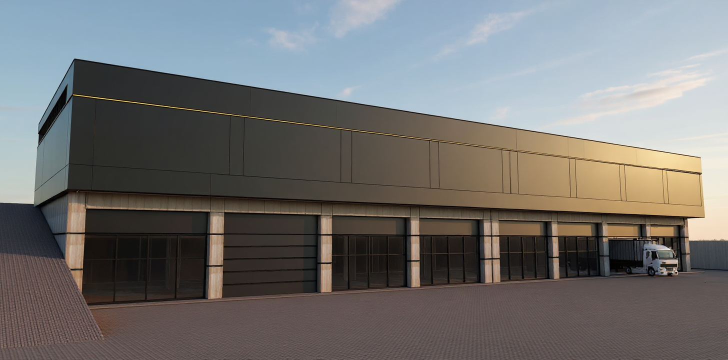 modern warehouse archutectural visualization vray render professional light setup led light large loading park lift and truck sun daylight