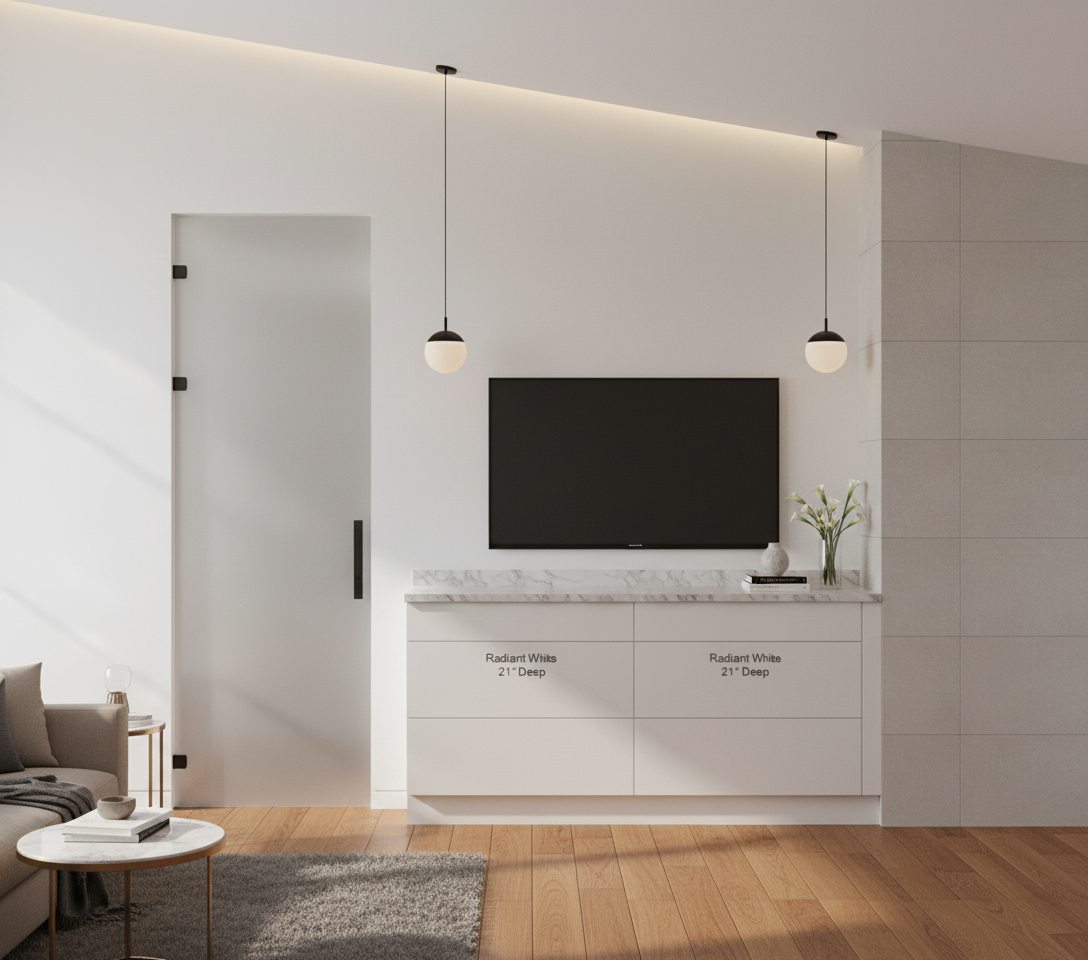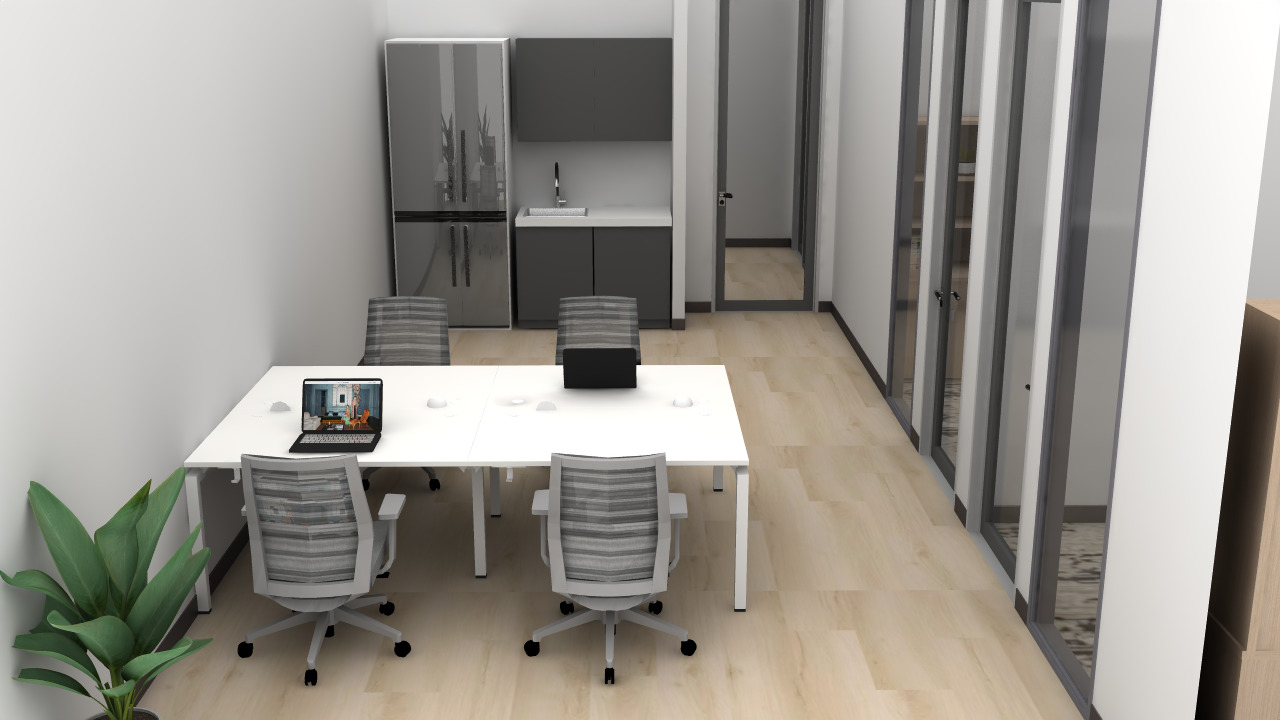 strict photorealistic enhancement only preserve exact furniture geometry layout scale and placement as modeled do not alter any object proportions hardware pulls or profiles do not add remove or substitute furniture or d cor maintain all specified finishes laminates wood grains fabrics and vinyl colors exactly as shown preserve wood tone grain direction and fabric color accuracy enhance lighting realism only using soft global illumination realistic shadow depth subtle material texture clarity and natural daylight balance 4000 4500k no redesign no reinterpretation no styling changes use high dynamic range lighting with realistic ambient occlusion and physically accurate reflections maintain true to spec color rendering add 2 photorealistic professional woman working at desk