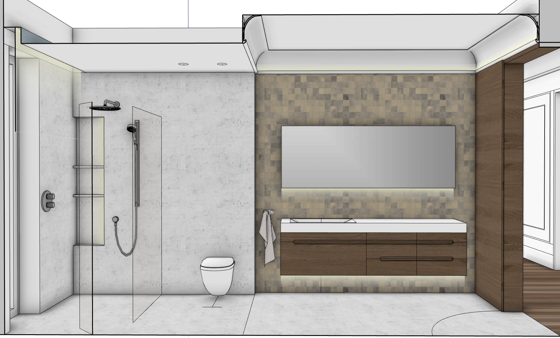 a modern and luxurious bathroom interior featuring a sleek walk in shower with clear glass panels the walls are a sophisticated light gray concrete texture creating an elegant and minimalist atmosphere the flooring is smooth light gray marble the vanity is adorned with dark walnut wood providing a rich natural contrast above the vanity a large rectangular mirror reflects soft ambient lighting which is gentle and warm adjacent to the workspace is a smooth contemporary white toilet with a chrome flush handle the color palette combines soft neutrals with natural wooden tones creating an atmosphere that is tranquil refined and spa like