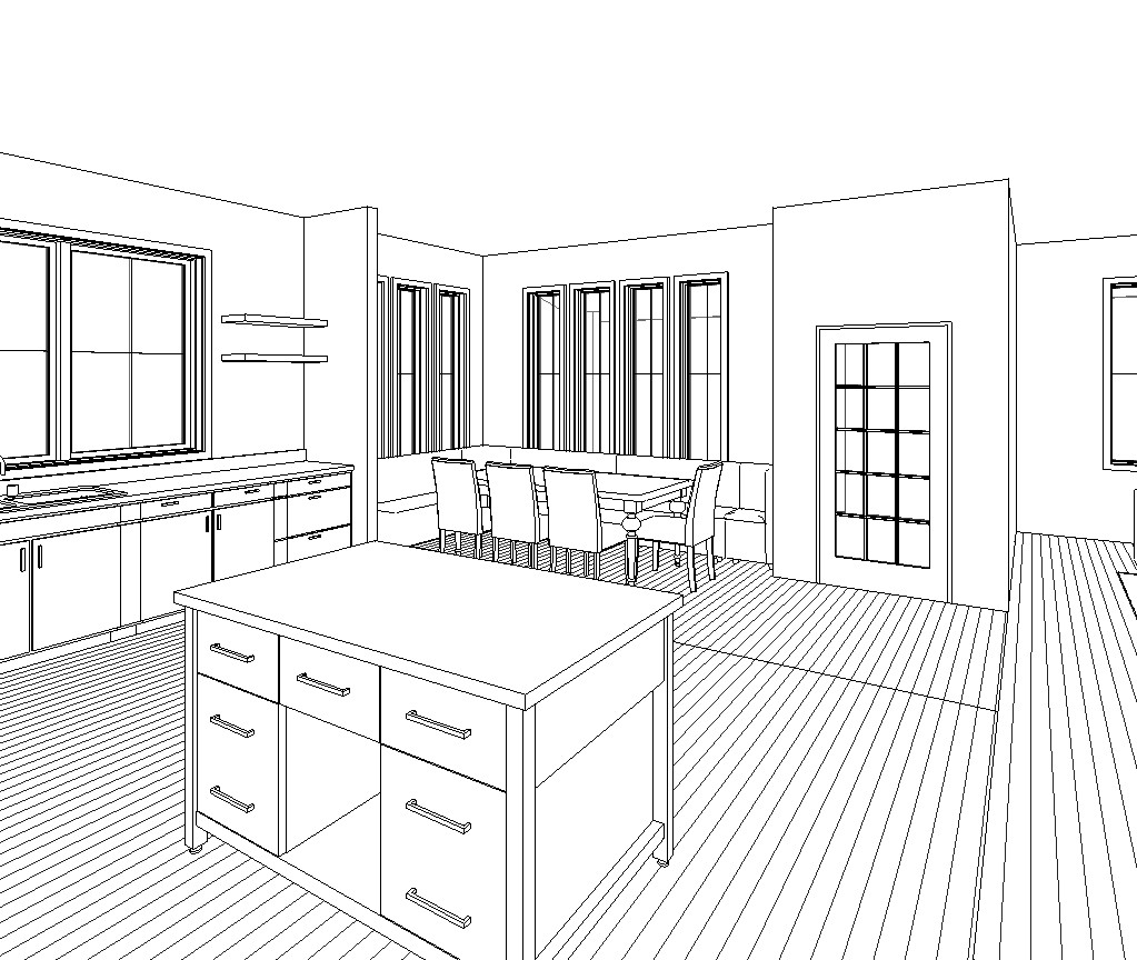 can you render this interior view for me i want the walls to be a warm white with white wide oak flooring marble countertops and black accents