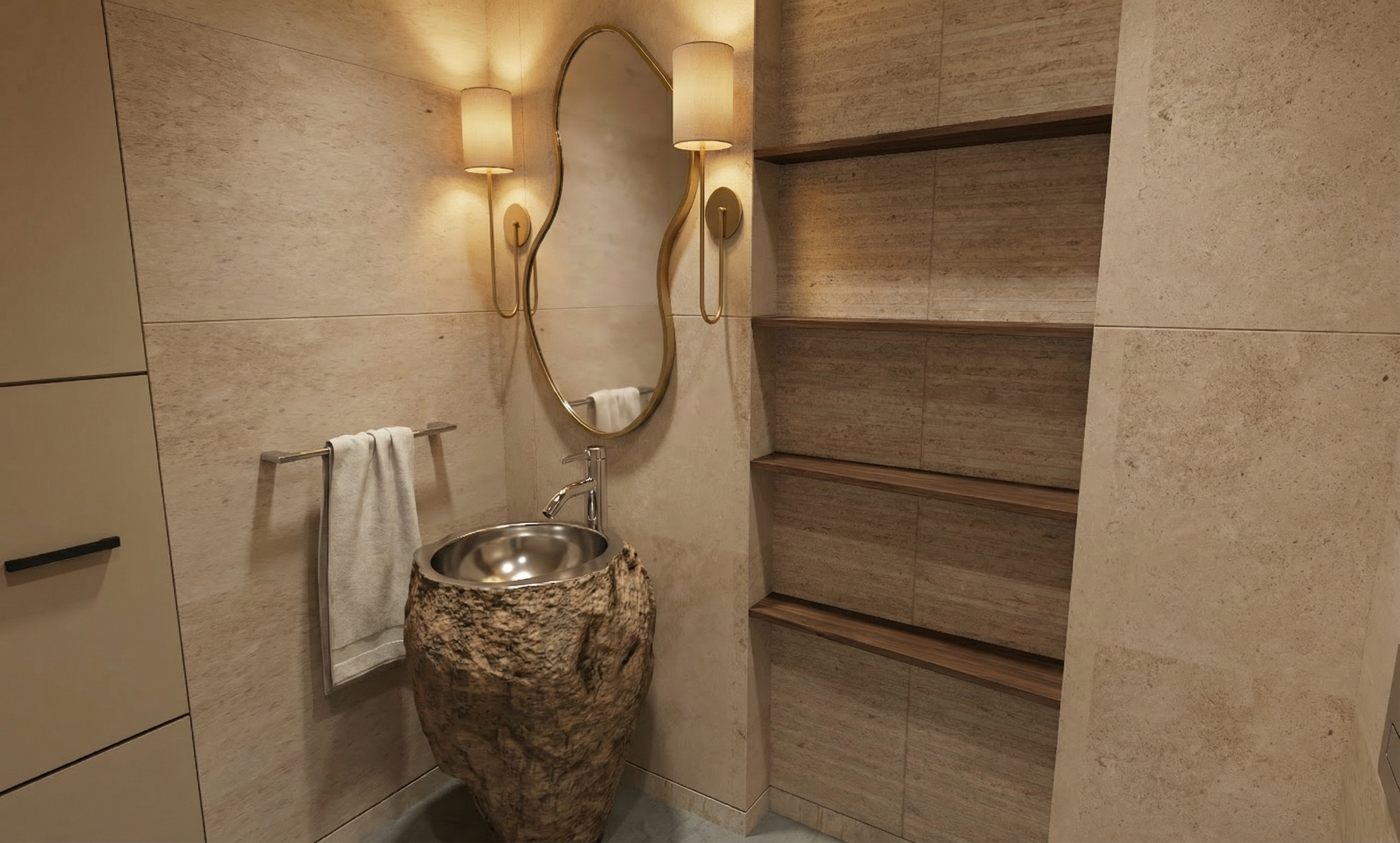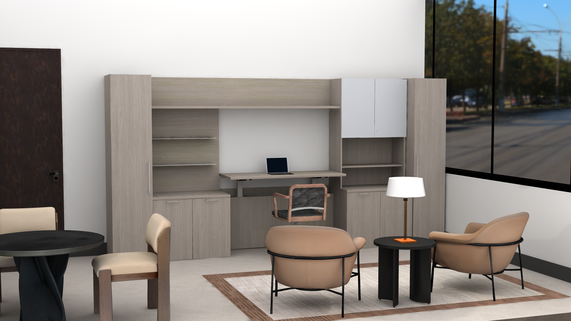 modern but moody tranquility space room is supposed to feel welcoming and zen add welcoming and calming lighting flooring is polished concrete make the space inviting it is located on the 2nd floor of an office building make the outside blurry add a few indoor plants to make it feel zen