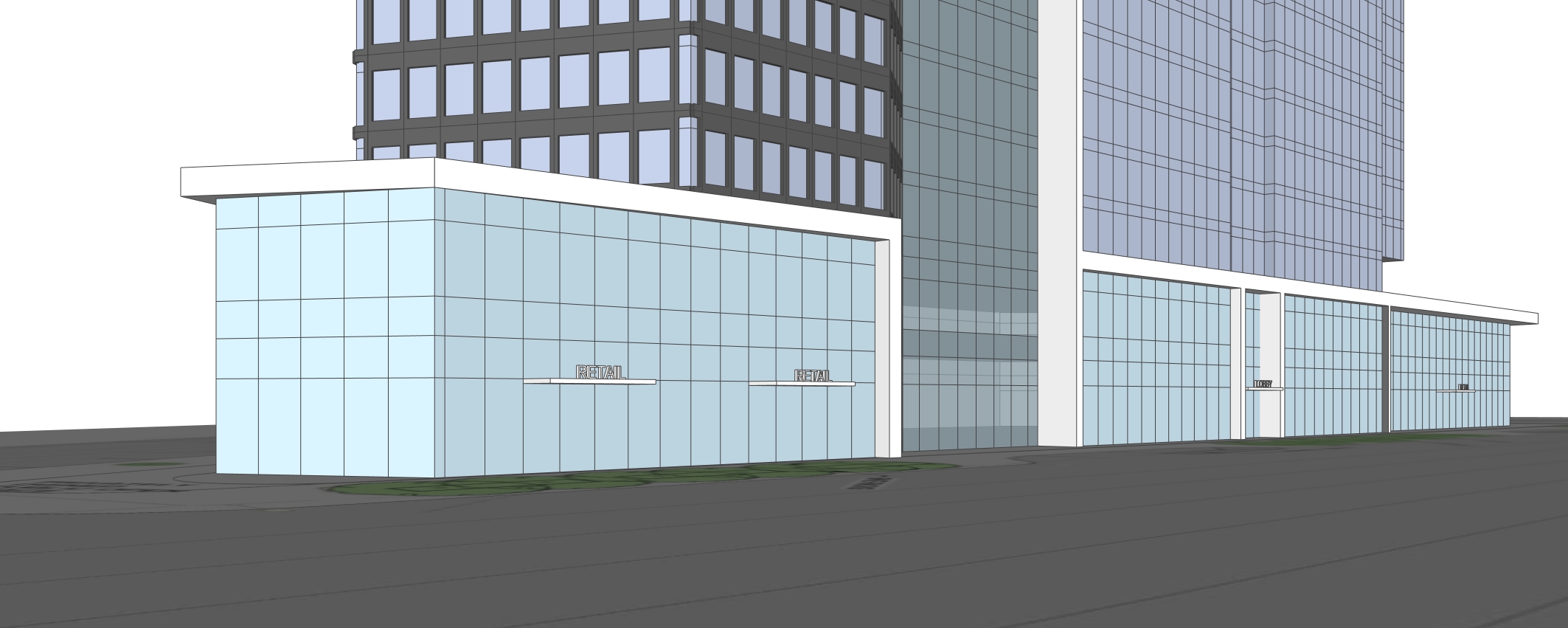 white background add retail and cafe at base of tower maintain massing remove cars make daytime