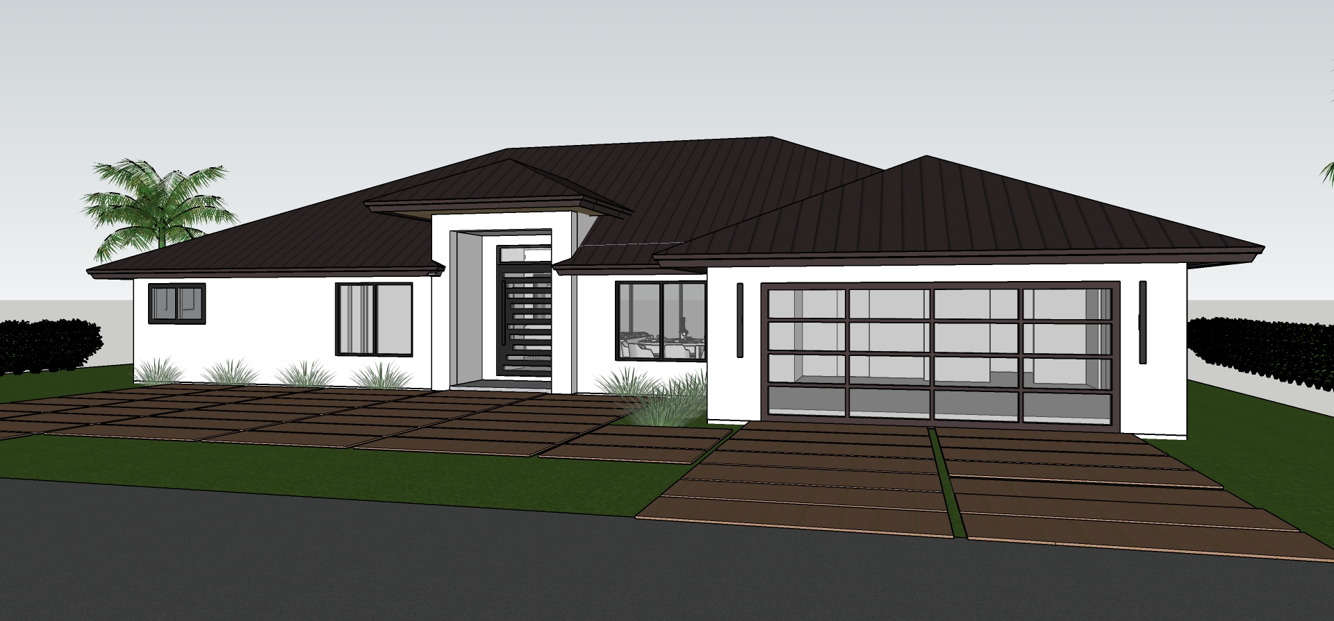 high quality photo realistic of a beautiful sunny day with blue sky luxury tropical suburban landscape located in florida brown roof with smooth white stucco walls slightly brown color for pavers with a light wet reflection