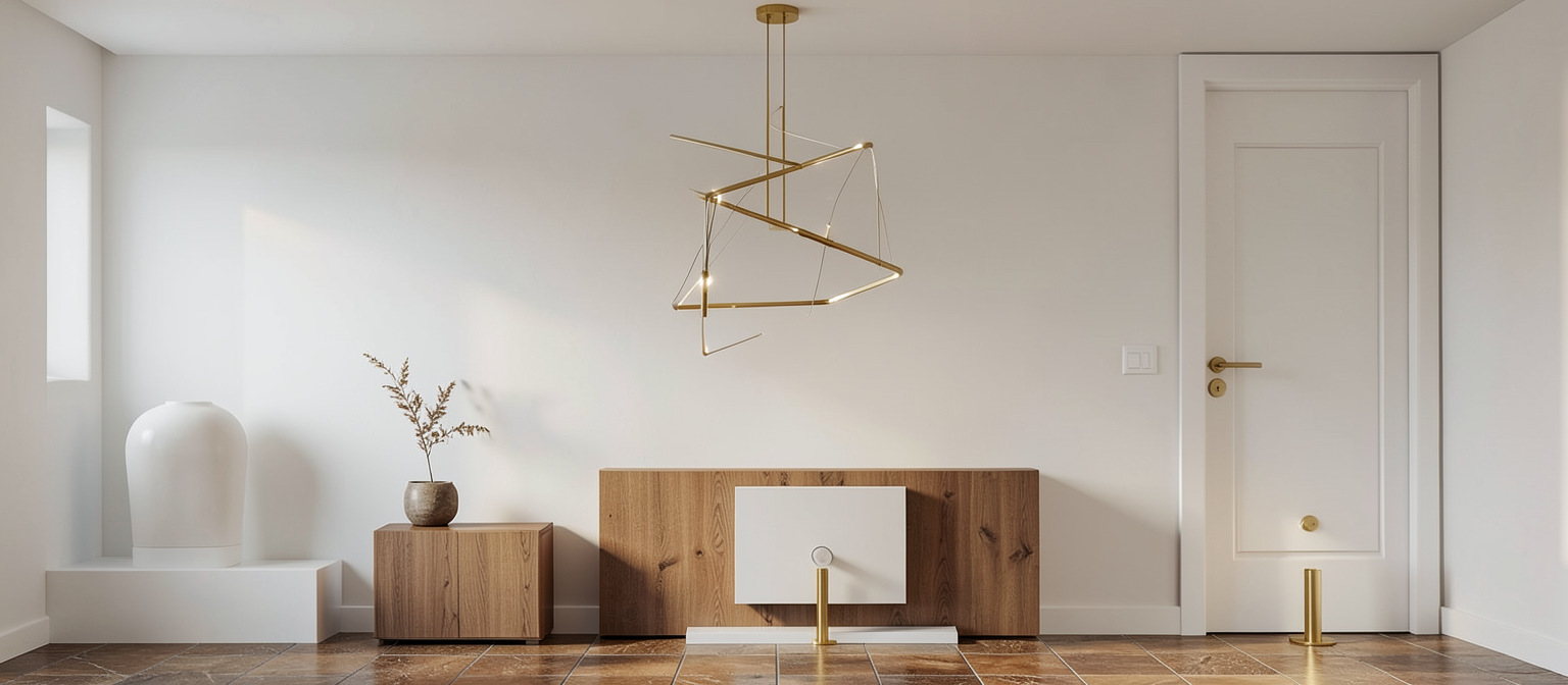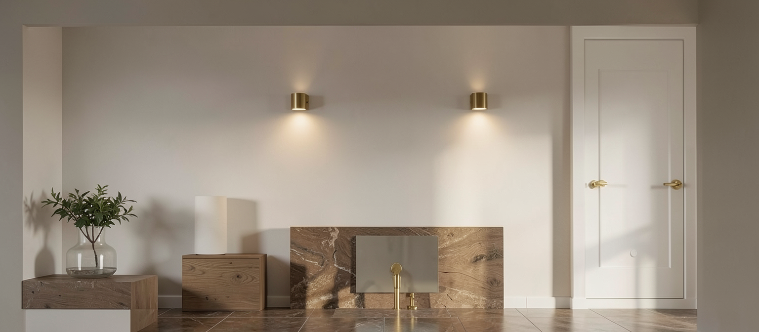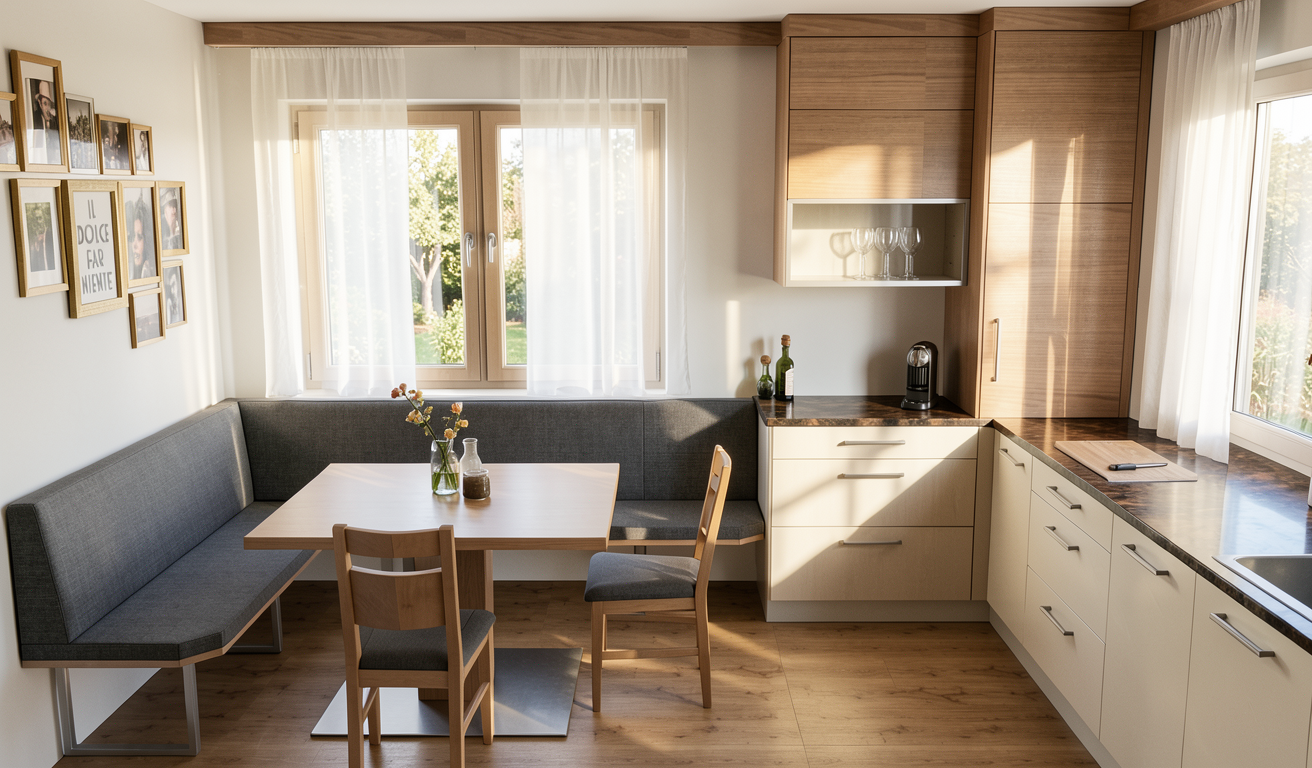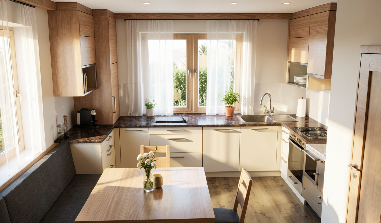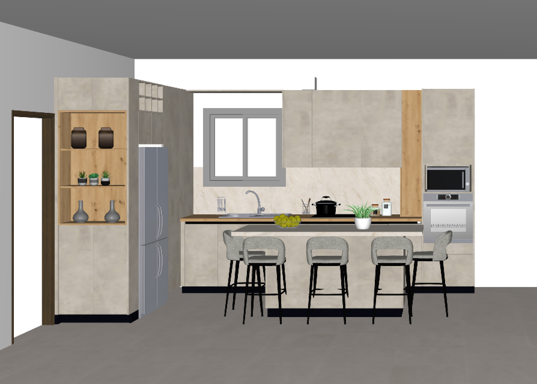 a modern kitchen interior with sleek minimalist design cabinets are in a soft beige with a subtle texture complemented by a natural wood accent the counter is a rich warm walnut brown contrasting beautifully against the light beige marble backsplash the bar stools have a muted gray upholstery with black metal legs the floor is a smooth medium gray polished concrete adding an industrial touch the appliances are a modern stainless steel finish add small decorative plants in white pots for a touch of greenery the atmosphere is warm and inviting flooded with soft natural light filtering through a large window