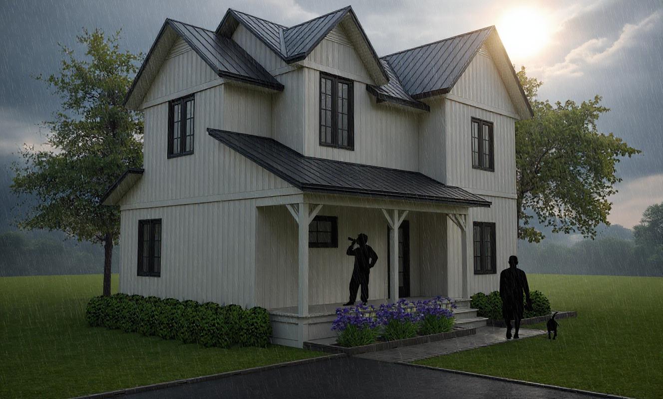 texas farm land setting with medium height foundation planting mottled brown roman brick bronze paint on doors windows fascia cream colored window frames oak trees in yard taper walk up to front porch gravel drive to garage door infill yard with fields of low height blue wildflowers in yard ramp sidewalk up to front porch ledge at base of house is concrete wall lights both sides of garage door sunset with interior lighting all windows full glass casement