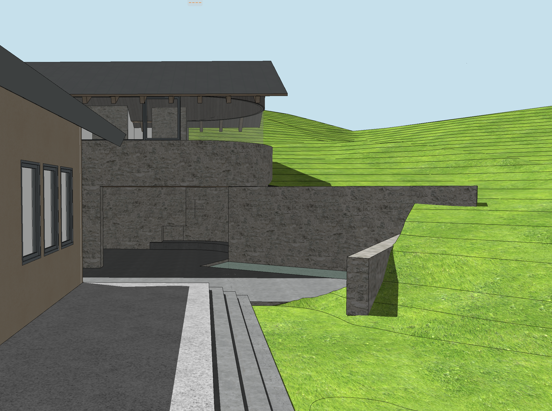 landscape hillside with sagebrush and tall wild grasses brown drystack stone walls corten standing seam metal roof