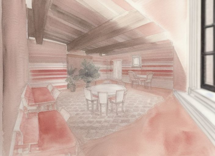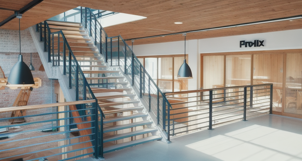 modernist interior shot industrial coworking space wooden details white walls concrete floor light ambience architecture