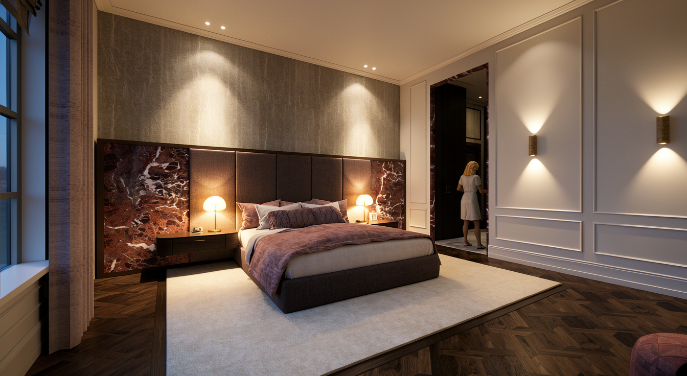 convert this image into an ultra photorealistic high end interior photograph of a luxury bedroom in a warm evening atmosphere mandatory preservation strict keep the original image exactly unchanged do not alter composition layout proportions scale or camera angle do not add remove or redesign any elements color material lock critical preserve all original colors exactly no color shifts in any materials or surfaces no global color cast no yellow orange tint overlay whites must remain neutral white greys must remain neutral grey warmth must come from lighting only not from color grading lighting warm evening high end transform lighting into a warm luxurious evening setting approx 2700k lighting must feel like a real high end bedroom with layered lighting ambient indirect soft warm light accents with smooth falloff no harsh contrasts no overexposure no dark underexposed areas brightness balance the scene must remain clearly visible and well balanced not too dark all materials and details must stay readable maintain a refined balance between warmth and clarity mood luxury bedroom calm intimate and sophisticated atmosphere high end hotel or boutique villa feeling soft inviting and premium realism high end quality photorealistic materials with micro detail and natural imperfections accurate shadows reflections and depth no cgi look must feel like a real photograph rendering style premium architectural photography clean soft cinematic and elegant subtle contrast refined lighting and natural depth negative constraints strict no redesign no color shift no color cast or tint no material changes no added objects no stylization or filters only enhance realism and transform the lighting into a warm high end evening atmosphere the result must be identical in design and color but indistinguishable from a real luxury bedroom photograph