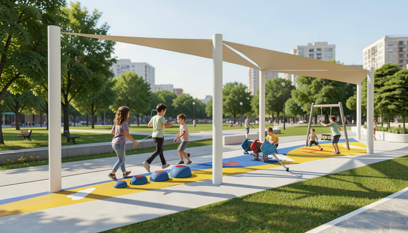 enhance this exact image without changing the original blue and yellow color values preserve the exact saturation and hue keep the grass background unchanged add only realistic material texture to the epdm surface subtle rubber grain and micro speckle soft directional shadow from one consistent sun angle gentle ambient occlusion under equipment increased edge sharpness and depth slight surface roughness variation no color grading no tone shift no warm filter no desaturation no cinematic lighting maintain flat orthographic 90 degree top view improve realism without altering colors