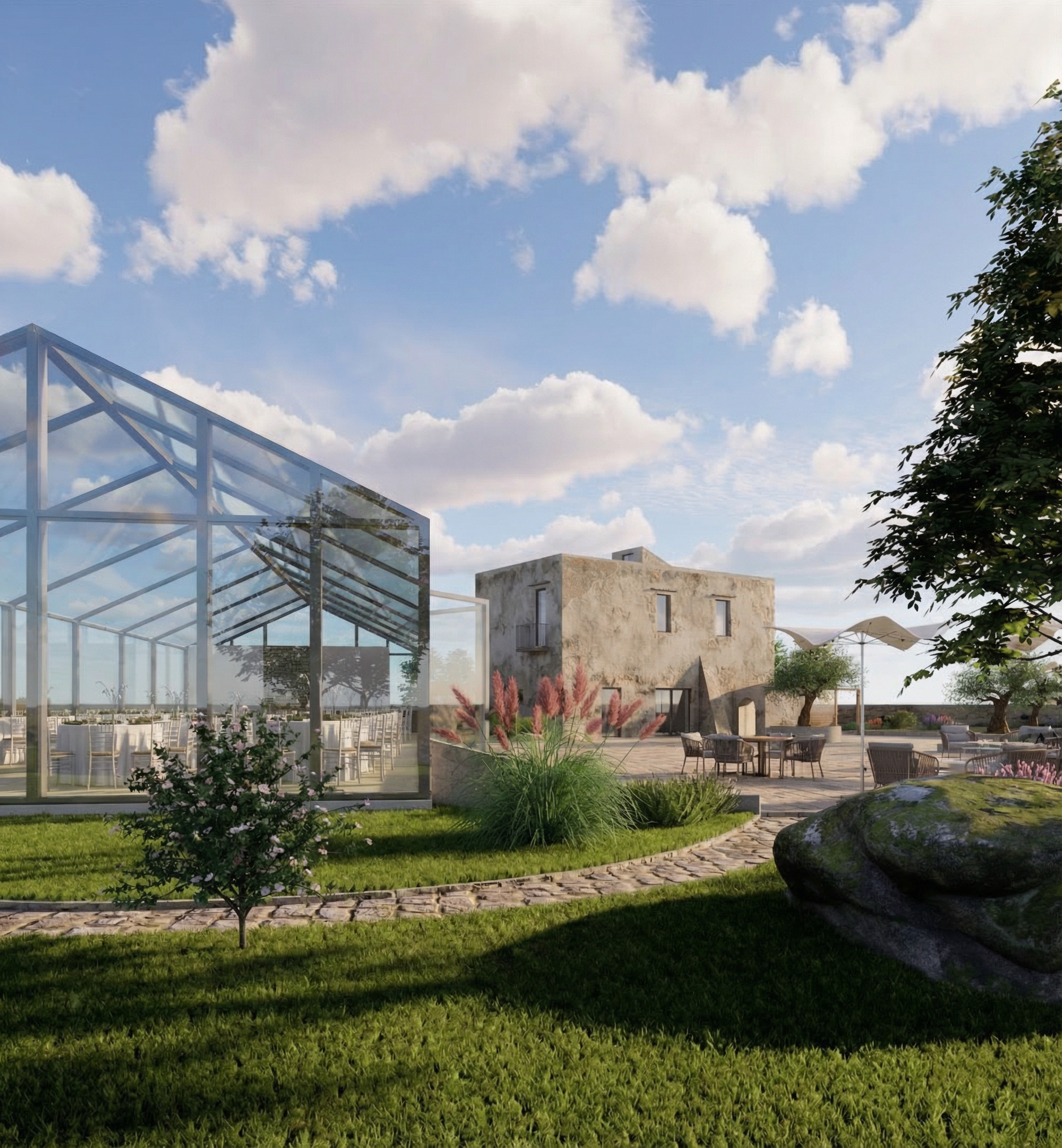 migliora il render non modificare l edificio sullo sfondo in particolare migliora il prato e le pareti vetrate della serra il sentiero pavimentato con pietra chiara