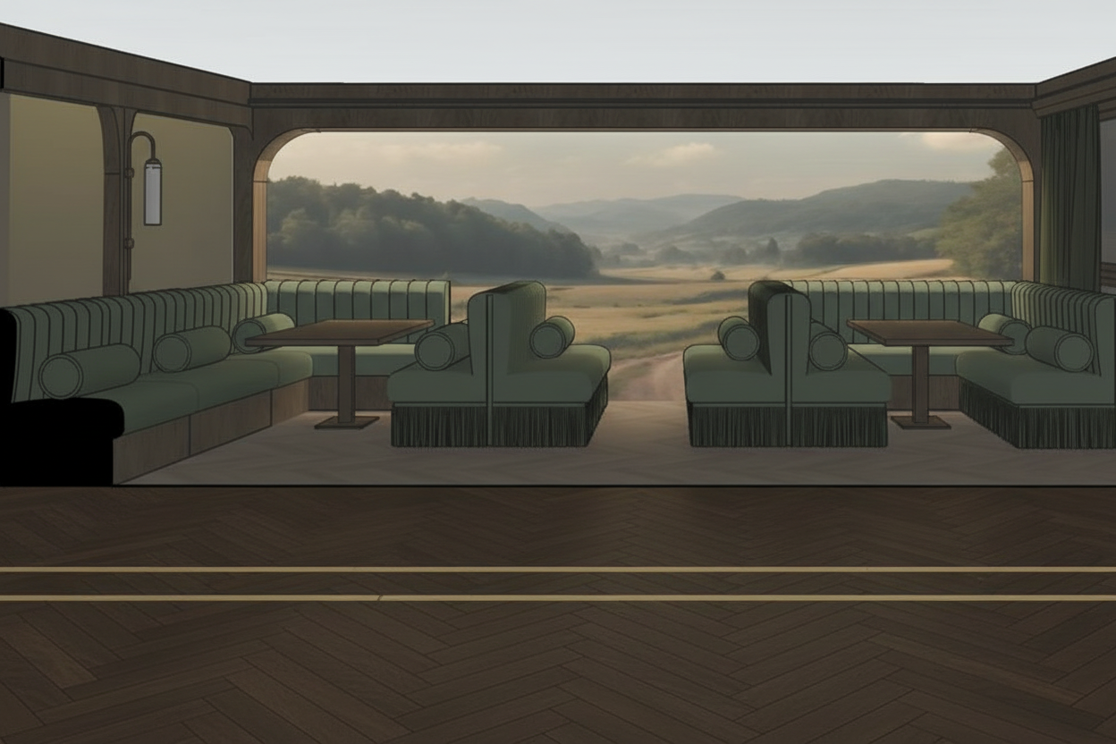 use booth seating fabric and material texture with fringe detail and bolster as the reference the mural is to be softly lit up and large window to the right using exact layout and dimensions