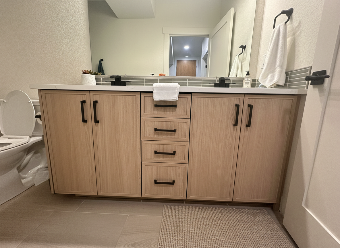 adjust the lighting to be more natural change the flooring make the toilet lid closed change the reflection in the mirror stage the countertop for simple modern feel change the towel hanging on the right wall to be folded neat add a simple modern picture on the wall above the toilet