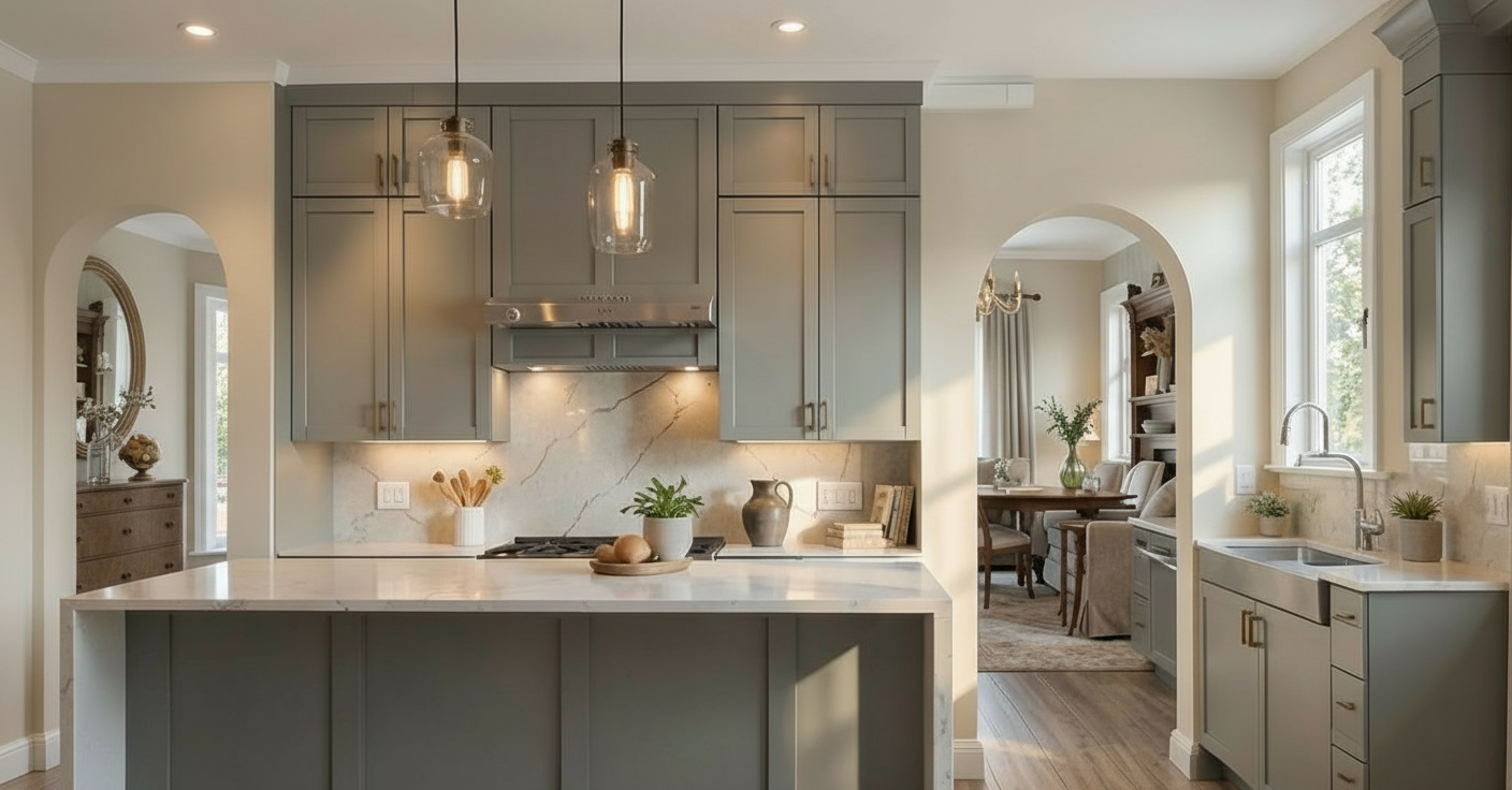 add a wall on the left side of archway with cabinets show the left wall more