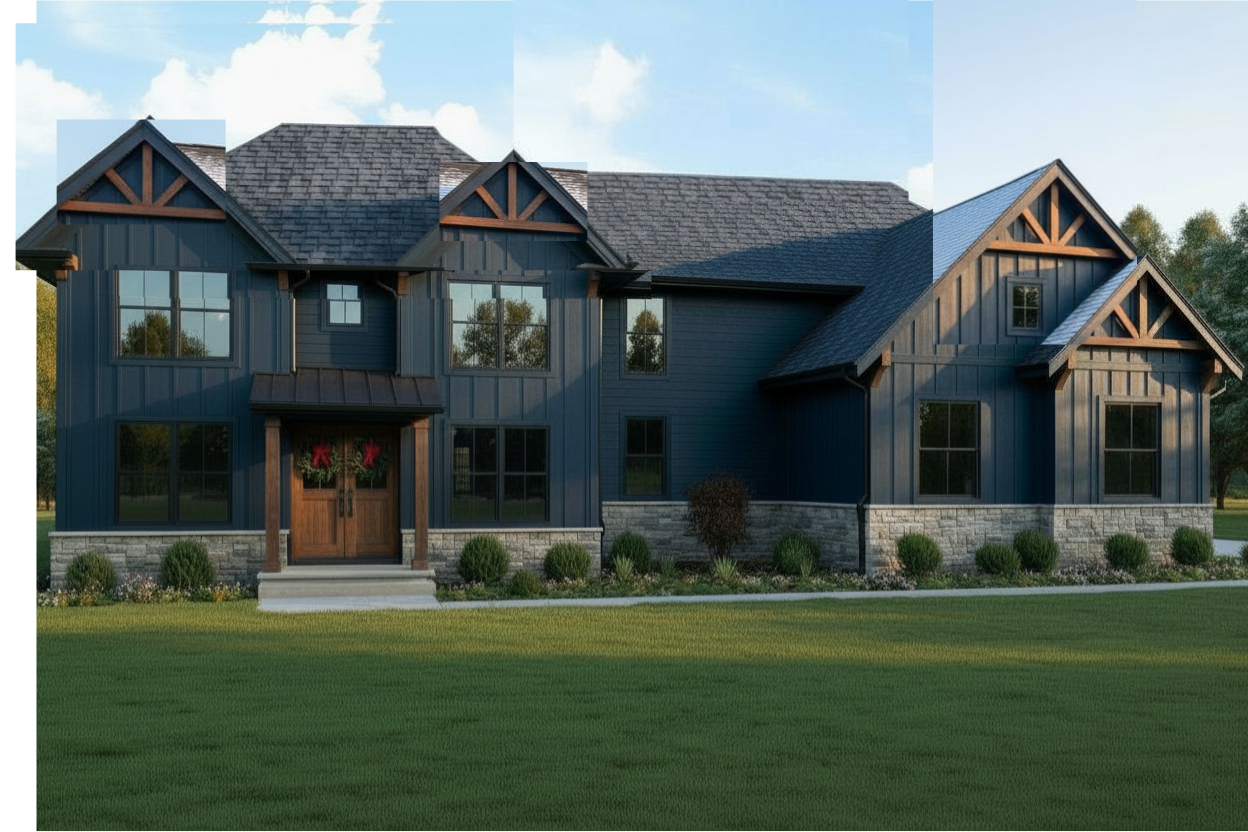 blue siding and roof line to line up correctly to look consistent throughout stone on upper roof area to be replaced with vertical siding
