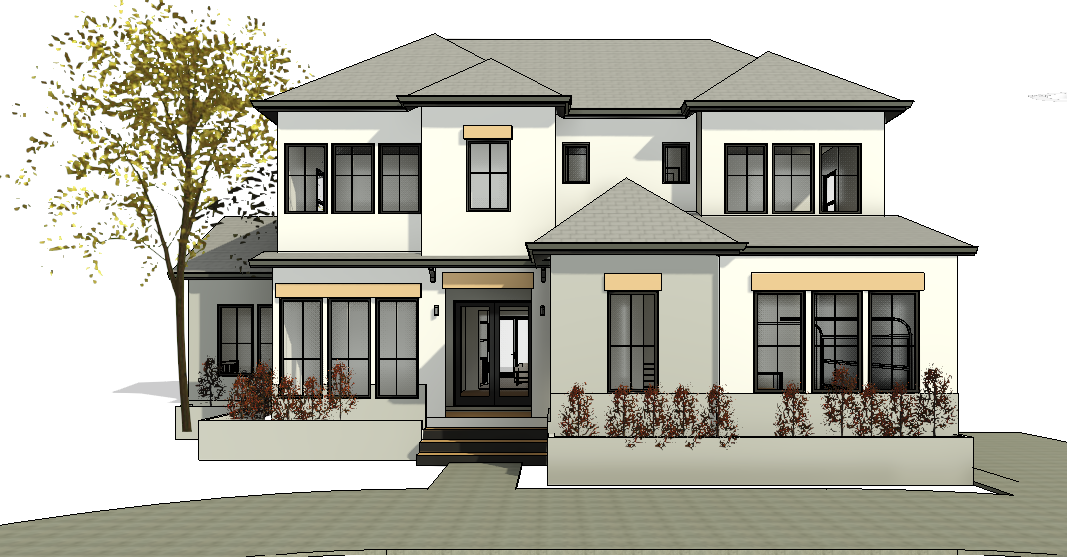 modernist exterior shot create a stunning modern two story house with a clean elegant design the facade should be a crisp white with large black framed windows creating a sharp contrast the roof is a subtle gray giving a sophisticated and contemporary feel the front door is sleek and dark framed by soft ambient lighting surround the house with well maintained shrubs in warm earth tones adding a touch of nature a large tree with autumn leaves on the left adds warmth with rich shades of amber and gold the path leading to the entrance is smooth and gray complementing the roof set the scene under a bright blue sky with a soft golden glow from the sun creating an inviting and serene atmosphere architecture