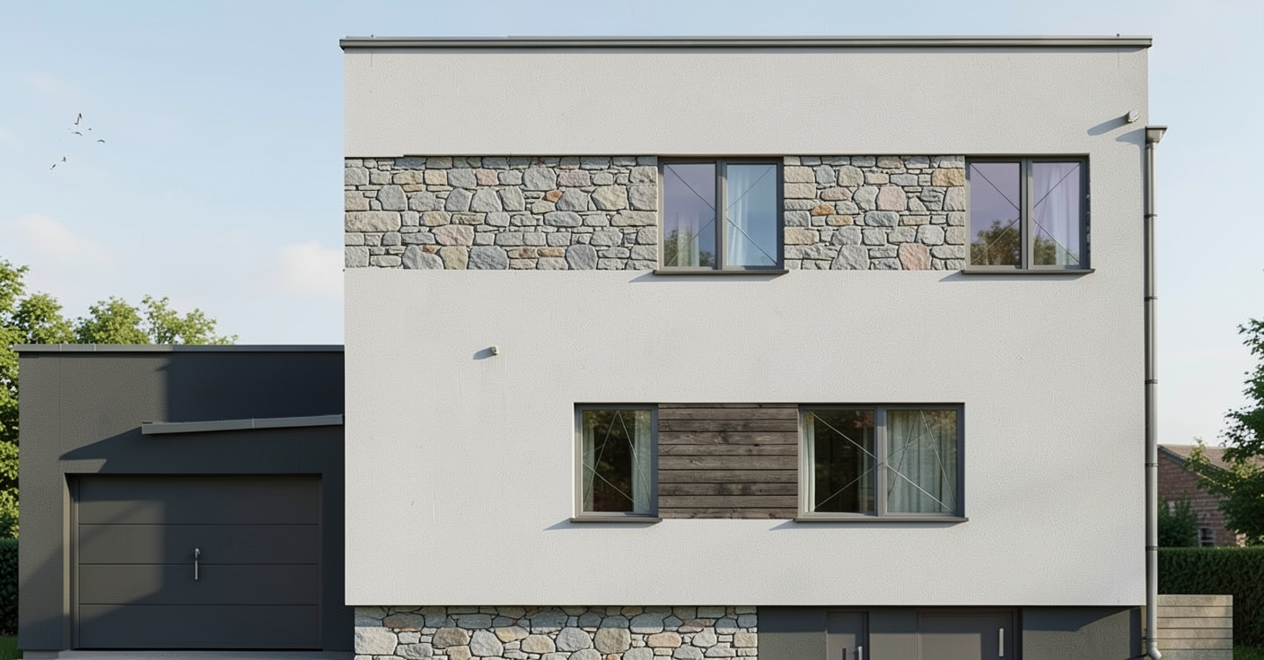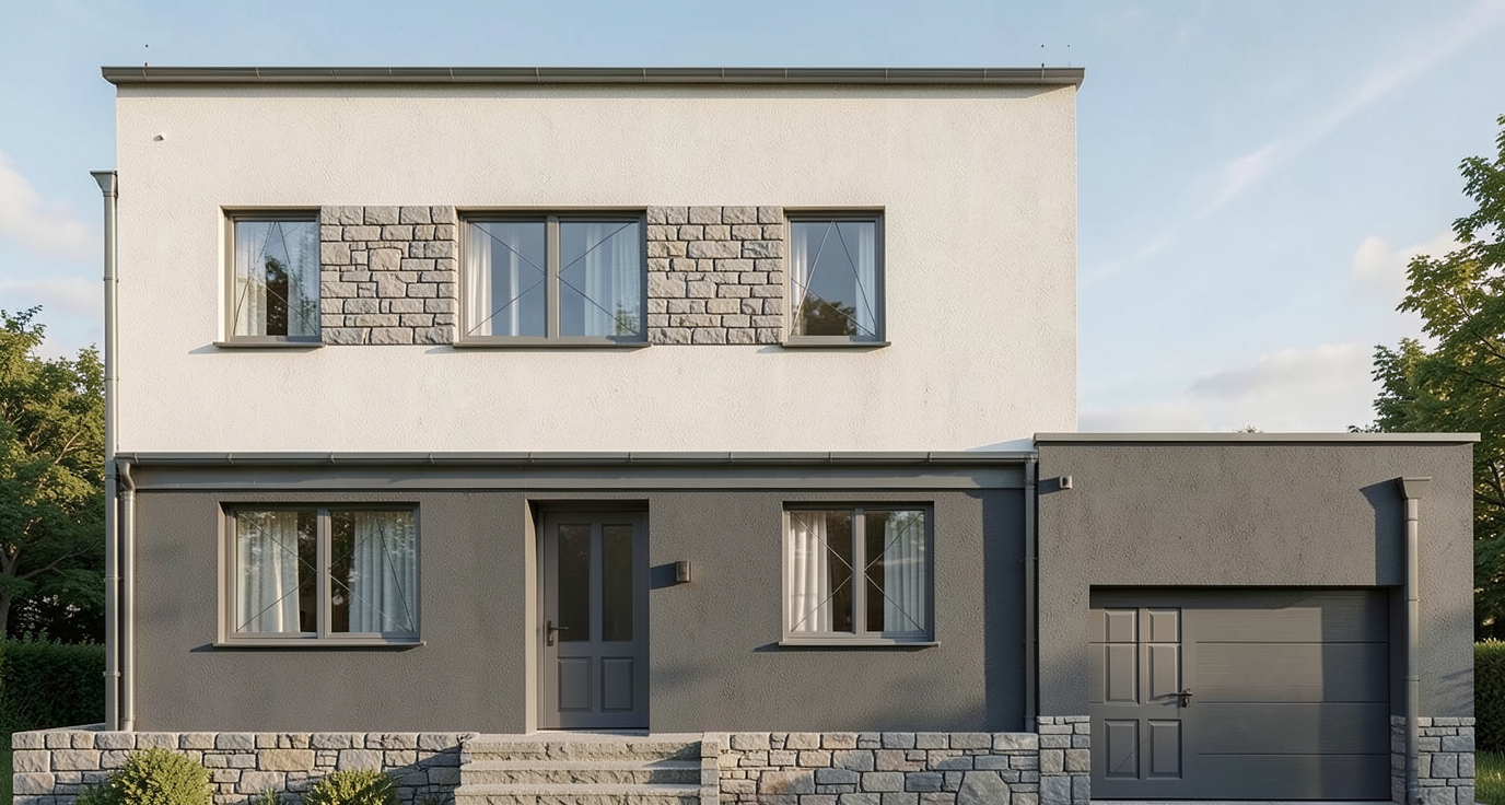 grey stone between windows on the level tall first and second level grey windows frame and doors grey walls dark and light garage with stone accent on the down