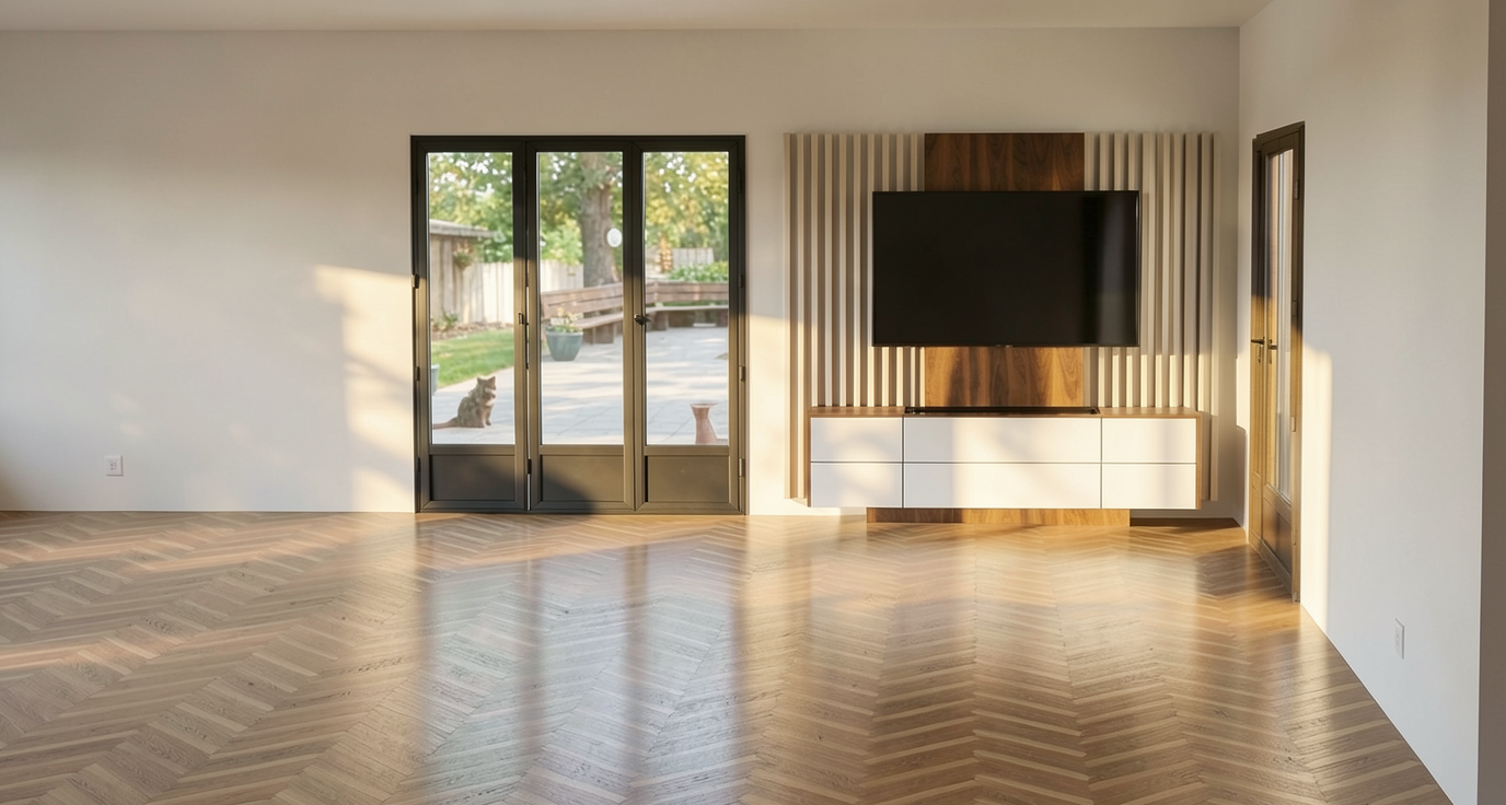 a modern row of townhouses with a cozy and inviting atmosphere the exterior walls are finished with a light beige brick texture the siding is a soft gray with white trim and the roof is a mid gray color each entrance features a classic white door with a small overhang surrounded by smartly placed white framed windows the front verandas subtle greenery the scene is set under a crisp blue sky with soft early morning sunlight casting gentle shadows enhancing the architectural details the townhouses are in a neighborhood