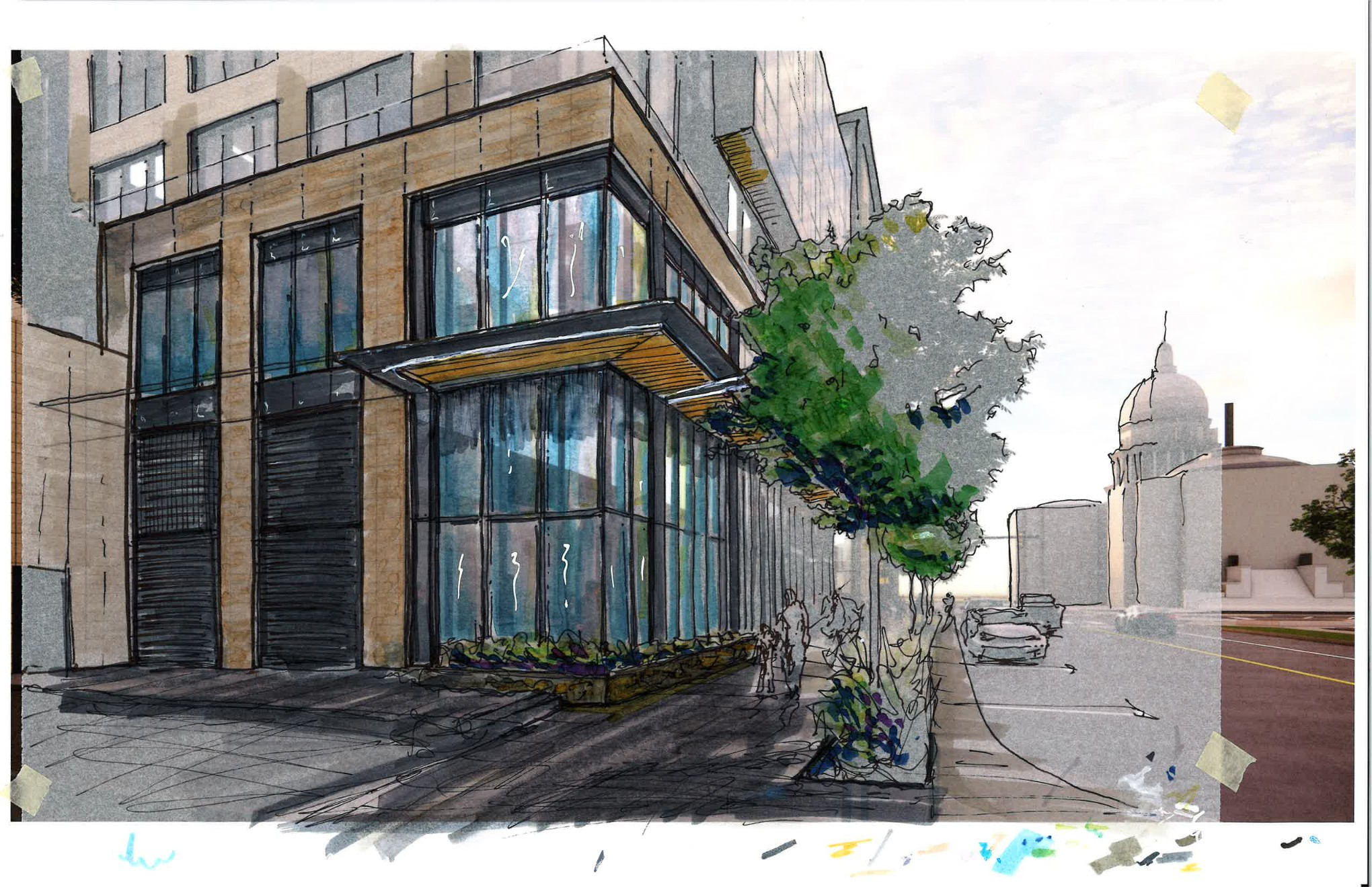 maintain colors main building material should be sandstone render image to hyper realisitic with cars on the roadway people walking on the sidewalk and retail activity happening inside