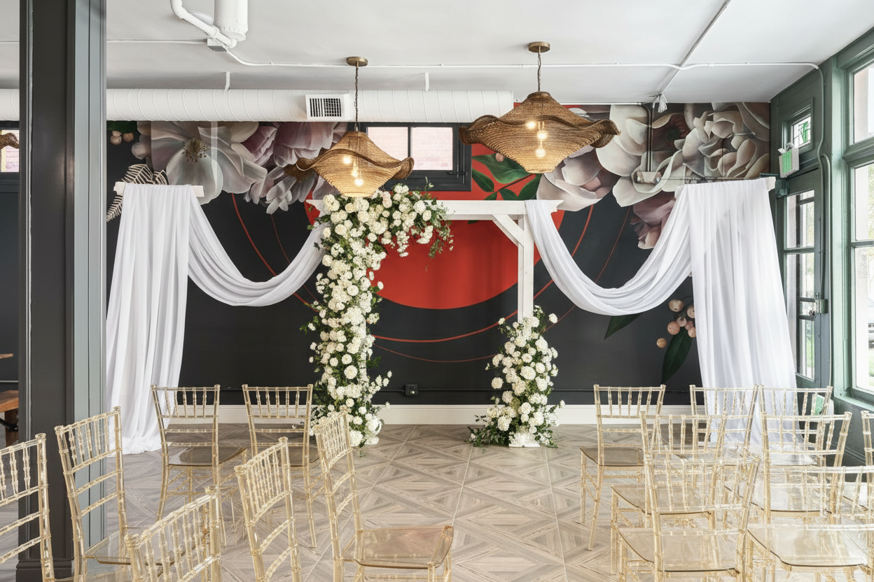 create a wedding venue scene in this room with an circular arch decorated in white flowers to match the wall art remove the chairs