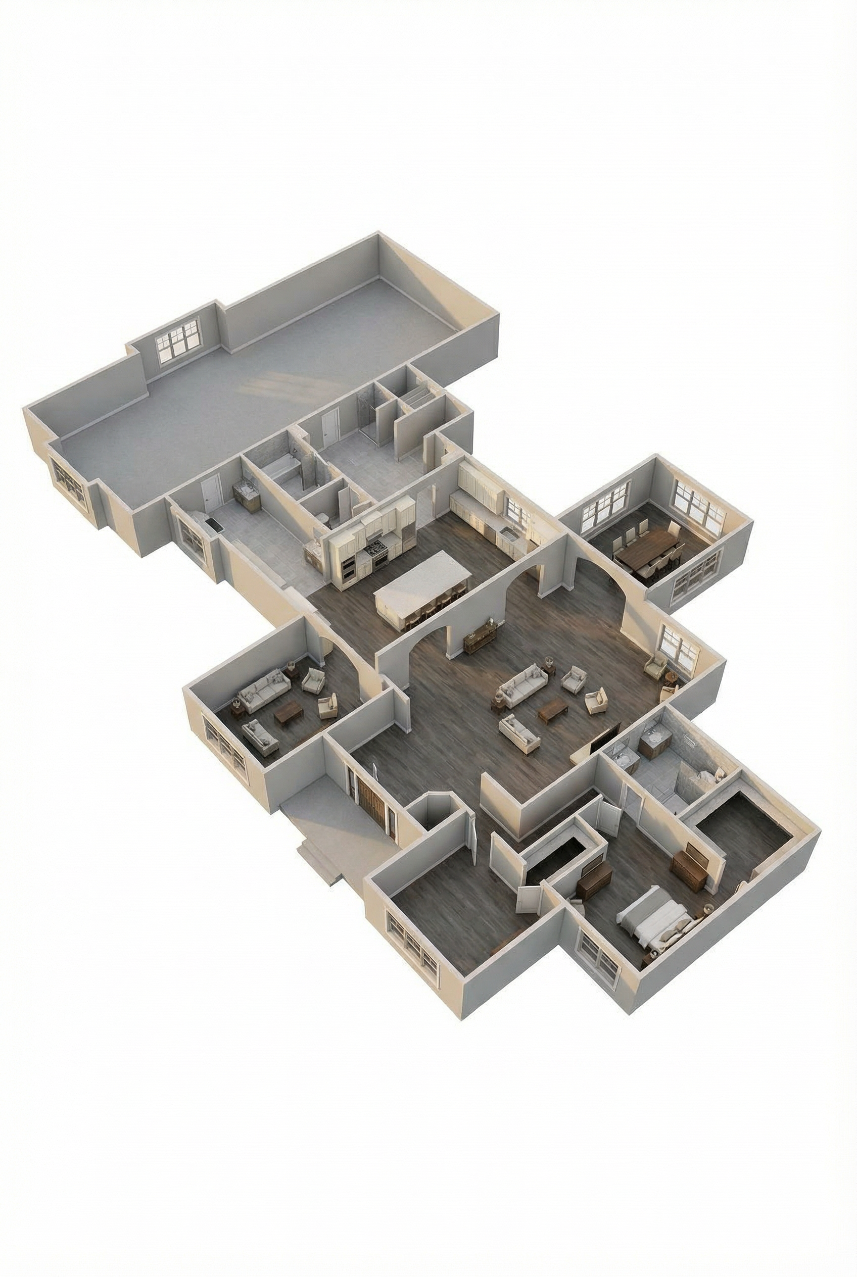 convert this floor plan into a realistic isometric 3d view of a full house show the space from an elevated angle with furniture walls and details visible rotate isometric 90 degrees use the same furniture as shows on the plan do not change the orientation of the floorplan