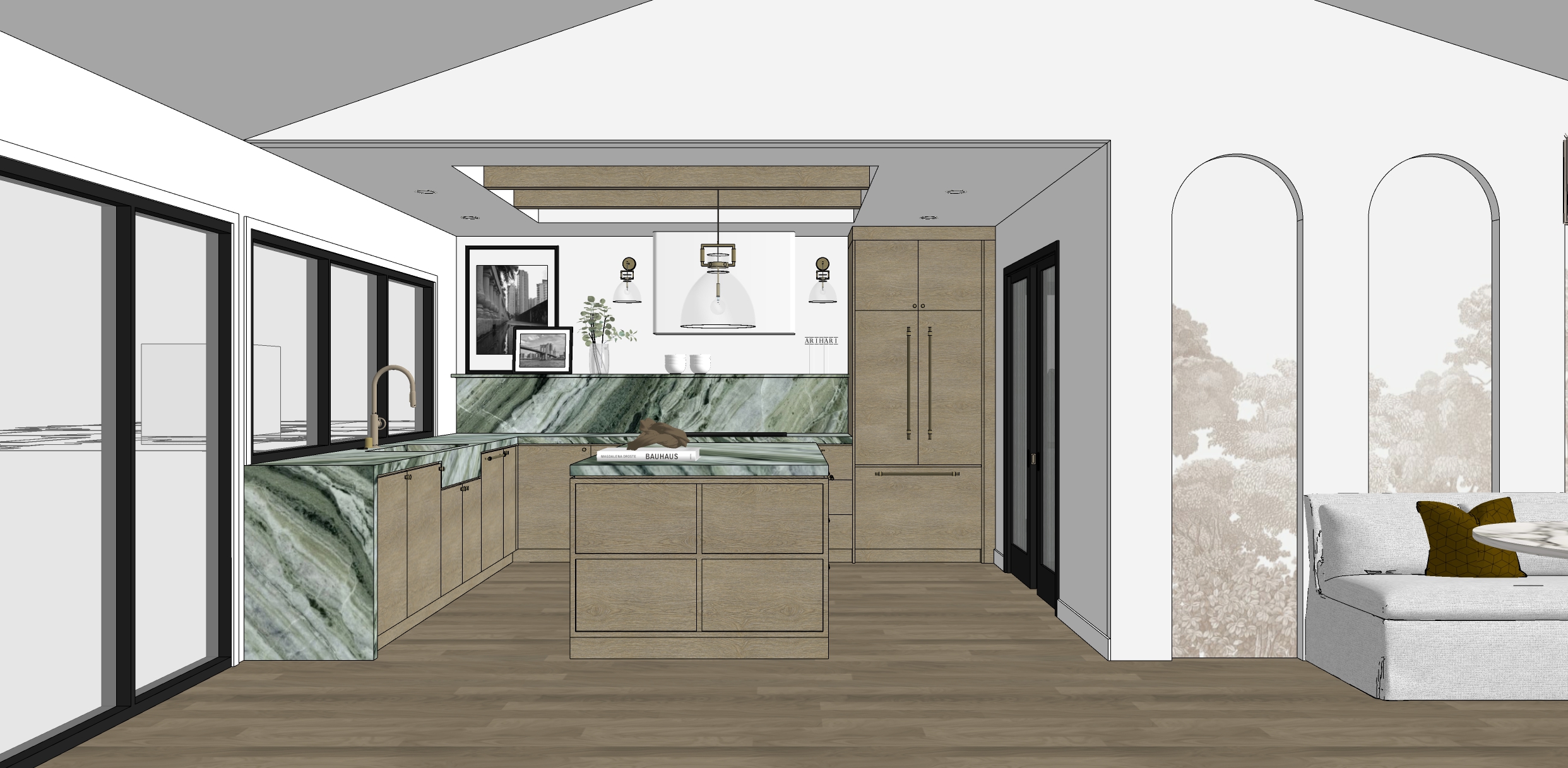 create a render in hyper realistic architectural visualization quality 8k resolution all objects furniture sanitary ware and architectural features must remain in place do not add any objects or delete anything from the image the spatial configuration must remain unchanged warmth gentle reflections soft shadows enhanced color richness and luxurious level realism improve depth and realism through wood grain richness brass highlights fabric texture and polished clarity while keeping the entire scene exactly as originally designed use downward facing light from the spherical wall lamp next to the round wall mirror use general daylight lighting in the room use a smooth white wall surface above the tiles the wall covering should be the same light color as the floor covering