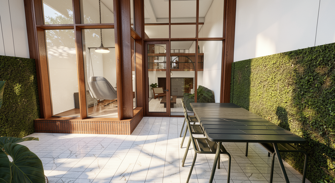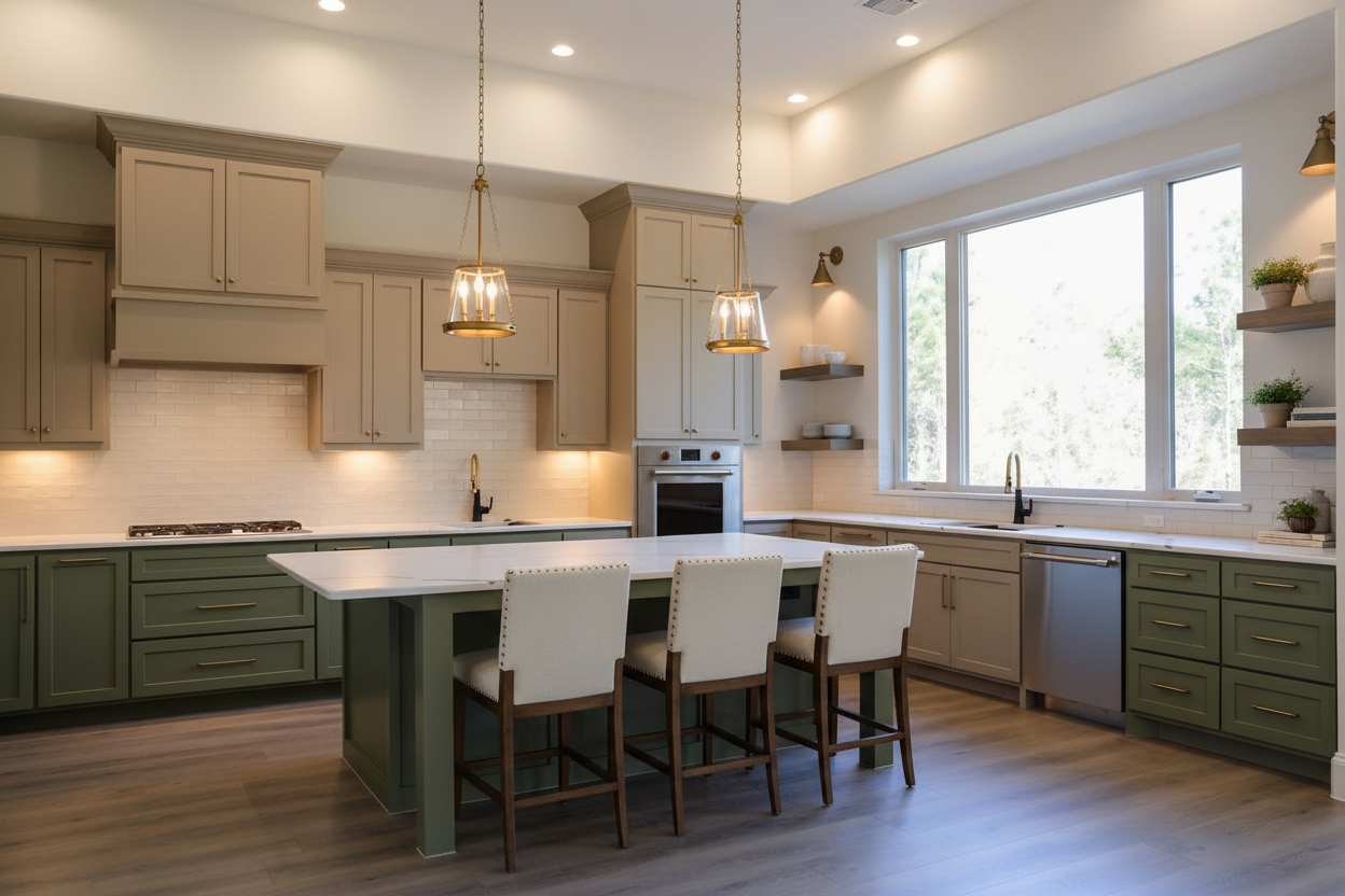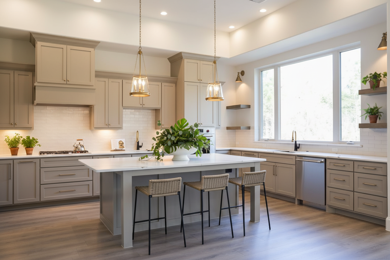 create a photorealistic interior render from the provided sketchup image keep the original geometry camera angle composition and materials textures exactly as they are do not redesign the space only improve realism lighting and rendering quality render as a modern high end kitchen interior with realistic wood grain matte surfaces accurate reflections micro texture detail and physically correct shadows add subtle styling for a modern mountain apartment atmosphere not overdone place 2 4 indoor plants in realistic positions e g a medium floor plant in a corner a small plant on the counter or shelf add a few tasteful alpine vintage accents minimal and curated one pair of vintage wooden skis mounted on the wall as a decorative element clean and elegant not cluttered optionally a small wool or linen textile detail e g neutral folded throw or cushion a small piece of mountain inspired decor e g minimal framed alpine photo subtle wooden object keep the space modern clean premium like a designer mountain chalet apartment lighting add warm under cabinet led strip lighting soft glow on backsplash and countertop add realistic ceiling lighting spotlights or linear ceiling lights with natural falloff add strong sunny daylight entering through windows creating soft sun rays and realistic daylight bounce balance artificial and natural light like a professional architectural photograph hdr natural exposure quality ultra realistic 8k sharp focus global illumination ray tracing realistic ambient occlusion clean render no noise cinematic but natural professional interior photography look do not change furniture layout colors textures materials cabinet design countertop type or any existing objects only enhance realism and lighting and add subtle decor and plants as described