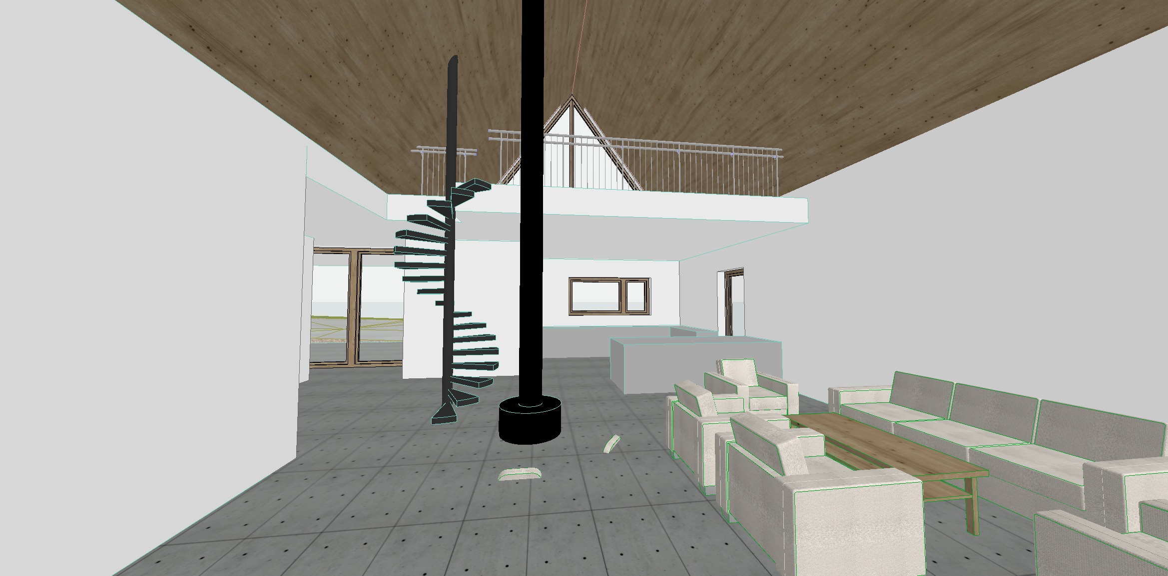 minimalistisch mit einer attraktiven k che im hinteren bereich die seite des k cheninsels zum wohnzimmer ist mit beleuchteten vitrine und weinschrank ausgestattet freischwebender kamin mit gem tlichen sessel