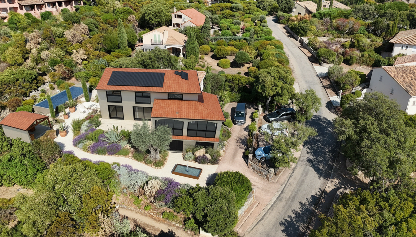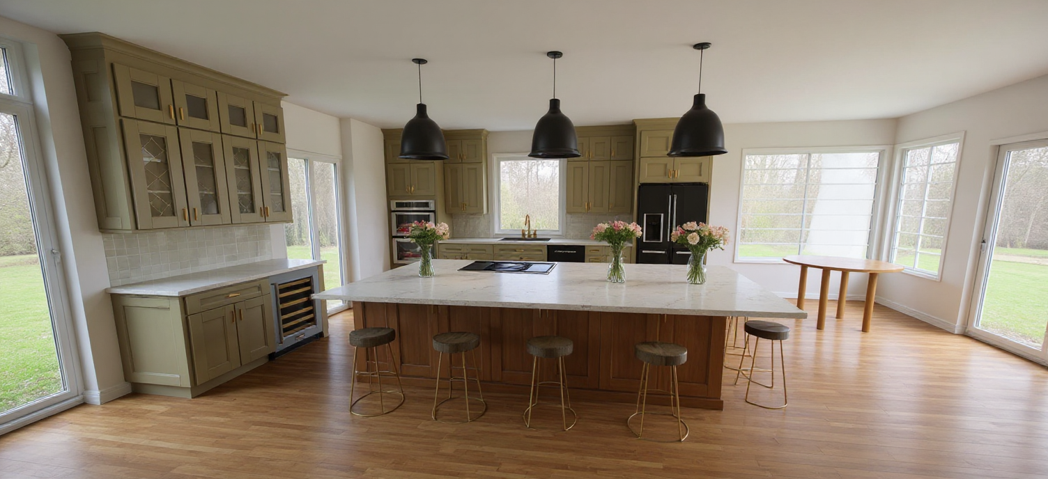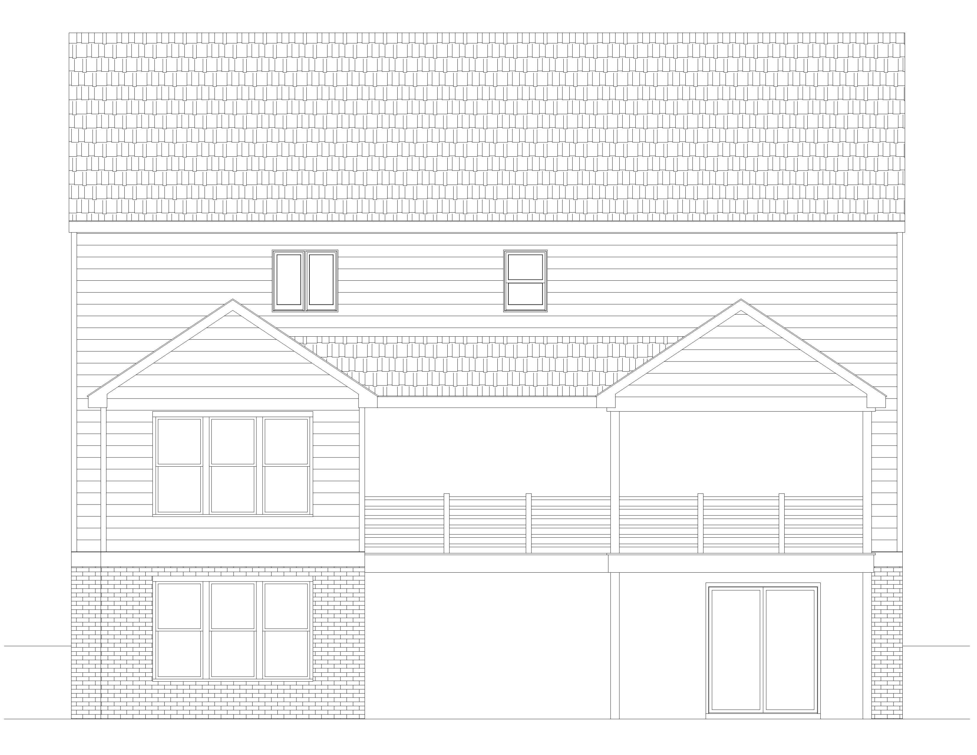 generate a beautiful rear elevation rendering of a two story house with a basement with a warm and inviting atmosphere the house features a modern design with a gable roof use soft pastel colors for the walls such as a gentle sage green and white trim for the edges and corners the roof should have a light grey tone with subtle shading to show depth the windows should have white frames and light reflecting glass set the scene during a serene golden hour with a partly cloudy sky casting a peaceful warm light across the house include a well maintained garden in front with lush green grass and colorful flowers like lavender and daisies to enhance the tranquil atmosphere