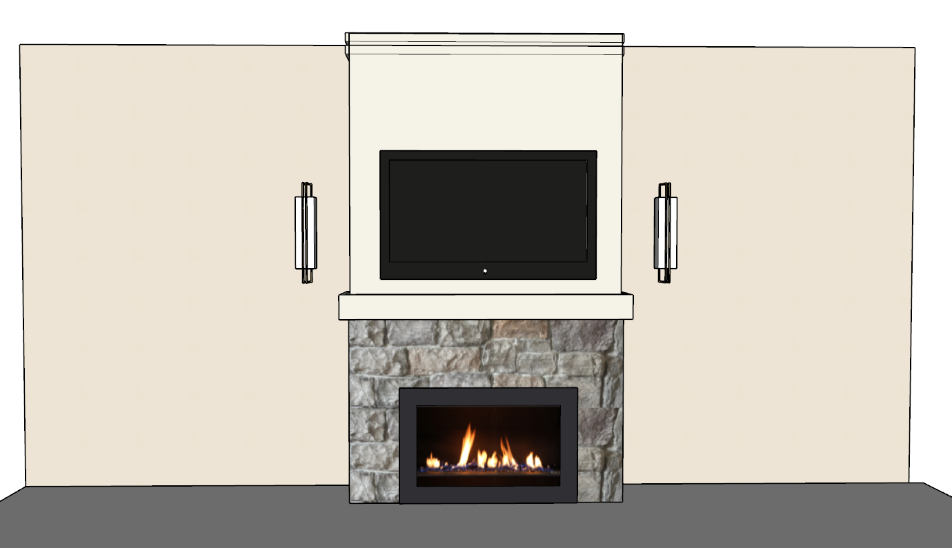 render a cozy elegant living room with a stone fireplace as the central feature the stones are in varied shades of gray and brown giving a rustic yet refined look above the fireplace place a sleek modern flat screen tv the wall is painted in a soft cream color providing a warm and inviting atmosphere flanking the fireplace are two contemporary wall sconces with a polished metal finish and frosted glass casting a gentle glow the flooring is a rich charcoal gray complementing the neutral wall infuse a warm ambient light throughout the room to emphasize comfort and tranquility