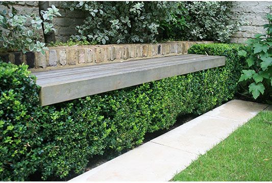 modernist exterior shot make bench in black stone and hedge behind it more thick architecture