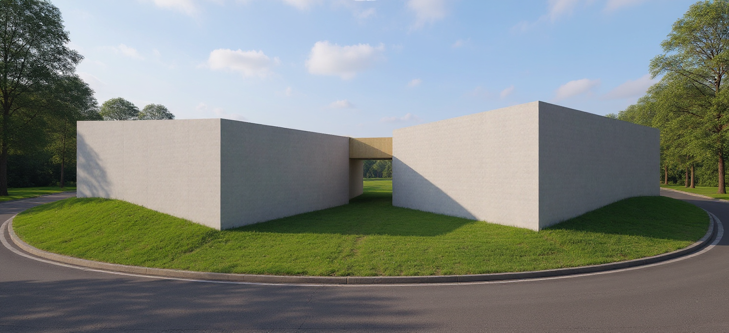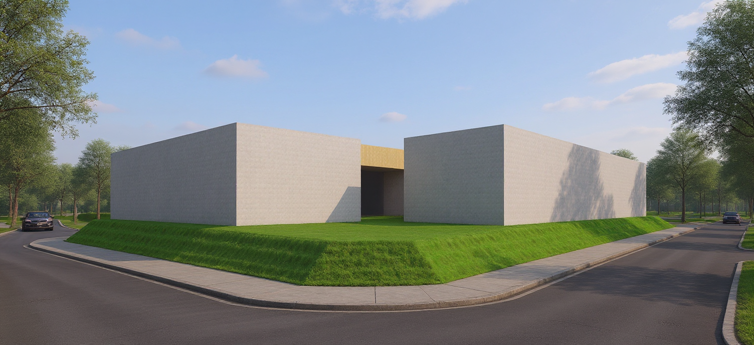 modern architcture with minimalistic on a little hill in the center of a street it consists of two structures connected in the middle it consists of two structures connected in the middle the main structures are parallel to each other